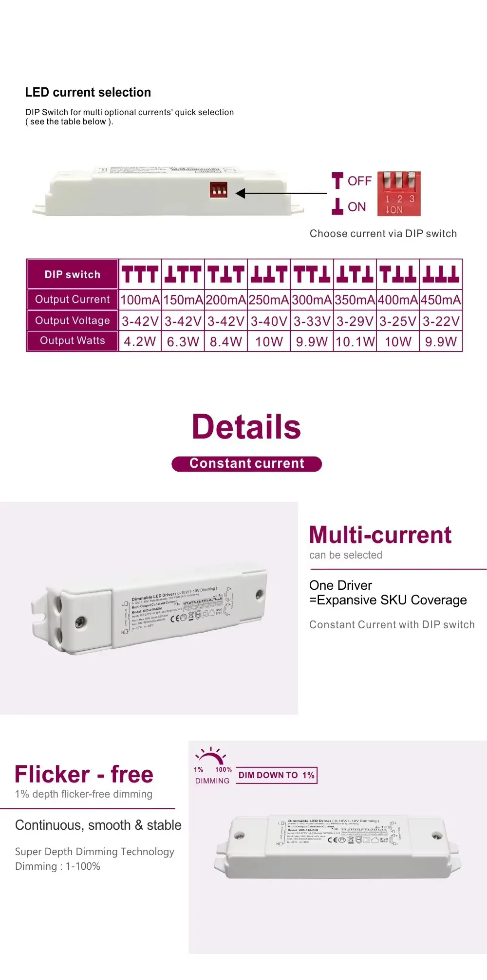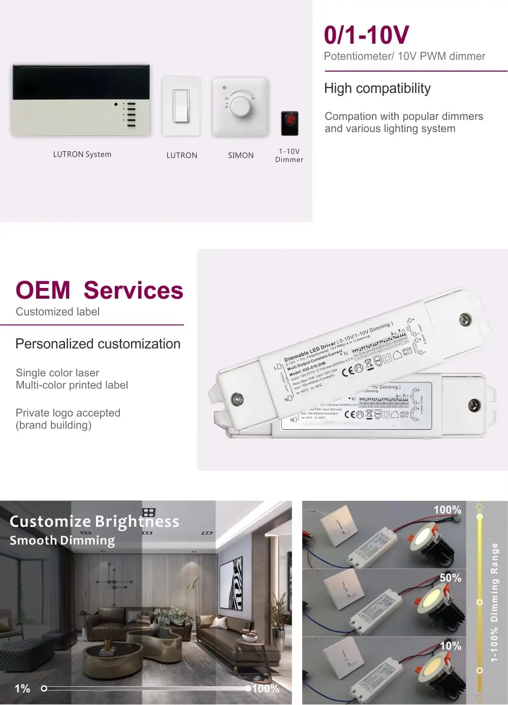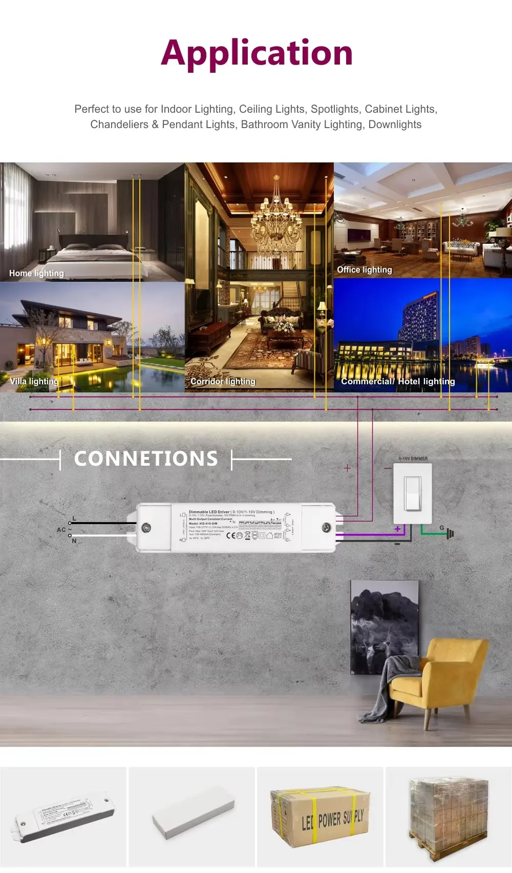 تم تصميم جهاز التعتيم هذا لتقديم أداء متسق، وهو يدعم خرج تيار مستمر واسع 3-42 فولت، مما يجعله متوافقًا مع مجموعة واسعة من وحدات وشرائط LED ذات الجهد المنخفض الشائعة. يضمن قبول جهد الإدخال واسع النطاق التشغيل المستقر في البيئات الكهربائية المختلفة. إنه قادر على دفع أحمال من 10 وات إلى 60 وات، وهو مناسب تمامًا لمجموعة من التطبيقات الداخلية - بدءًا من الإضاءة المميزة والخلجان وإضاءة المهام أسفل الخزانة في المنازل، إلى الإضاءة المحيطة الأكثر تطلبًا في الفنادق والمطاعم والمكاتب.