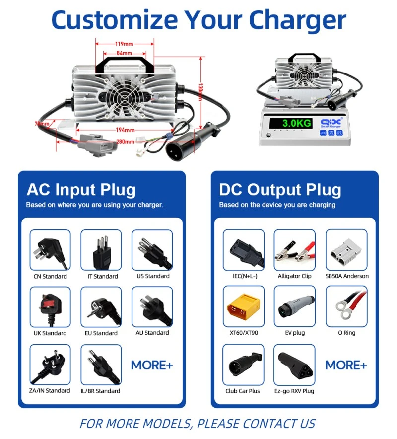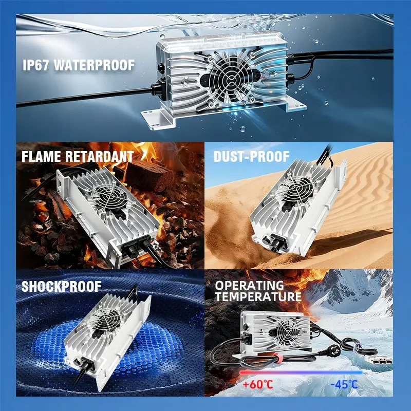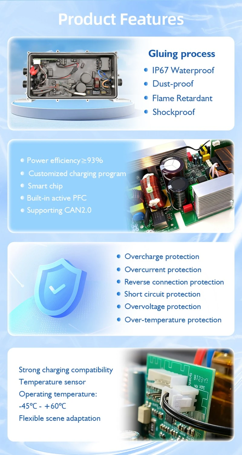 يتميز هذا الشاحن بقدرة 1.2 كيلو واط وتيار إخراج 25 أمبير، ويمكنه شحن بطارية 48 فولت 100 أمبير في الساعة بالكامل خلال 4 ساعات فقط، وهو أسرع بنسبة 20% من أجهزة الشحن العادية بقدرة 1000 واط. يقلل تصميم الدائرة عالي الكفاءة من فقدان الطاقة إلى أقل من 10%، مما يوفر الطاقة مع ضمان الشحن السريع، مما يجعله مثاليًا للسيناريوهات التي تتطلب تجديدًا سريعًا للبطارية.