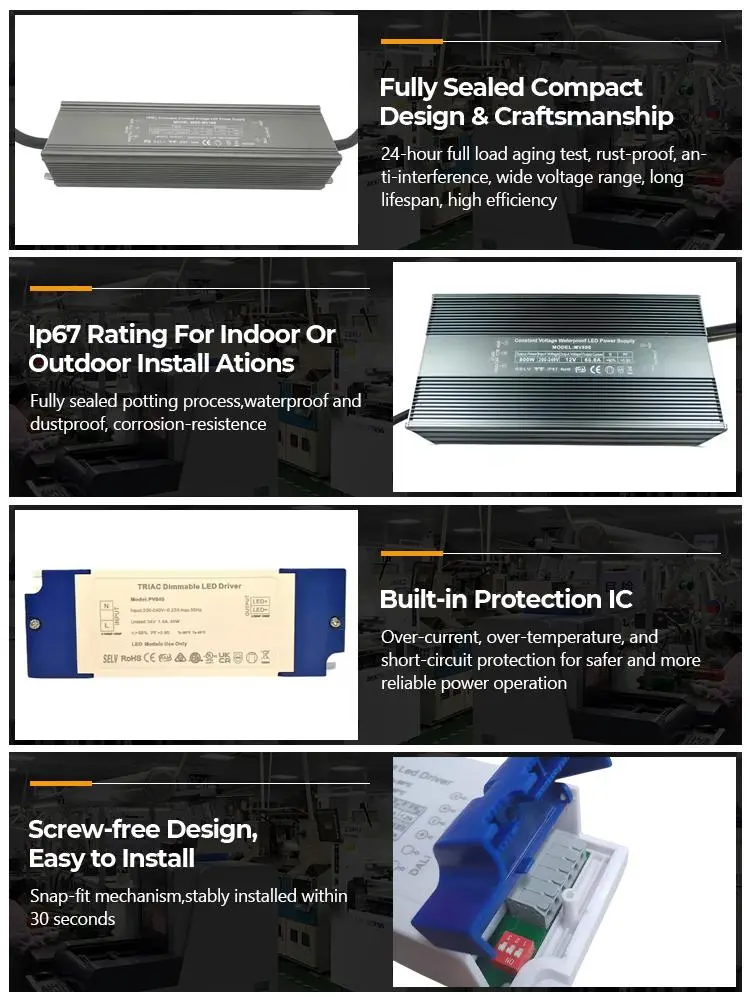 مشغل LED المقاوم للماء بتيار مستمر 1200 مللي أمبير عالي الجودة من STARWELL، مصمم خصيصًا لتركيبات الإضاءة LED في البيئات الخارجية/الرطبة، متوافق مع أضواء الشوارع 10-40 وات، وأضواء الحديقة، والأضواء تحت الماء، وصناديق الإضاءة الإعلانية وغيرها من السيناريوهات المتعددة. اعتماد شريحة تيار ثابت عالية الدقة، خطأ تيار الإخراج هو ± ± 3%، ويتم الحفاظ عليه بدقة وثبات عند 1200 مللي أمبير، مما يزيل بشكل أساسي الوميض (عمق الوميض أقل من 5%) ومشاكل تسوس الضوء، والتي يمكن أن تطيل عمر خدمة تركيبات LED بأكثر من 30%؛ مجهزة بتقنية الختم المقاومة للماء IP67 + تقنية التأصيص المقاومة للماء، لا يصل مستوى مقاومة الماء إلى أي تسرب لمدة 30 دقيقة عند عمق 1 متر تحت الماء، وهو قادر على التعامل مع البيئات القاسية مثل المطر والماء المتناثر والغبار، مع عمر عمل مستمر في الهواء الطلق لأكثر من 50000 ساعة، مما يجعله أكثر موثوقية للاستخدام على المدى الطويل.
