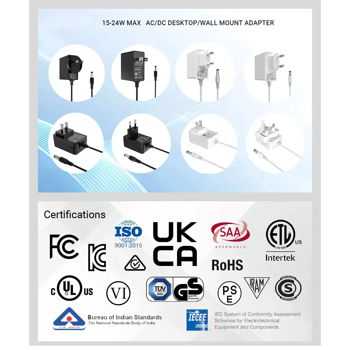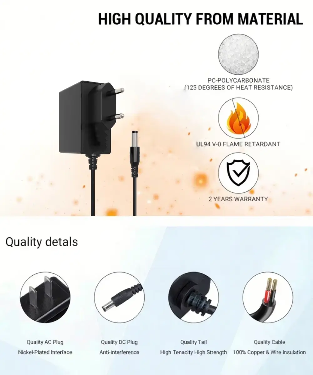 تتوافق سلسلة محولات الطاقة بقدرة 24 وات مع المعايير الدولية الصارمة وتتمتع بشهادات عالمية، بما في ذلك شهادة CE/FCC/UL/RCM/SAA/UKCE/KC/BIS/PSE، مما يضمن السلامة والامتثال البيئي. يسمح تصميم القابس الأوروبي باتصالات آمنة، مما يجعل من السهل استخدامه في إعدادات مختلفة.