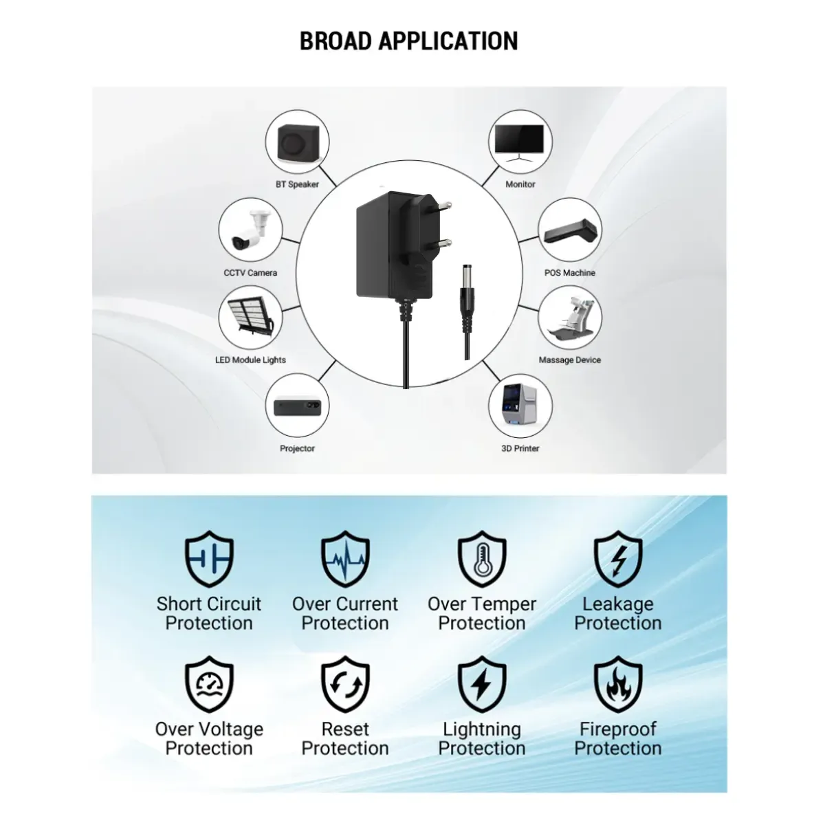 2. توافق واسع: بفضل مخرجه القياسي 12 فولت وقابس أسطواني DC المشترك (عادة 5.5*2.1 مم)، فهو مثالي للأجهزة المختلفة مثل أجهزة التوجيه ومفاتيح الشبكة وكاميرات الأمان وصناديق الاستقبال ووحدات تحكم الألعاب.