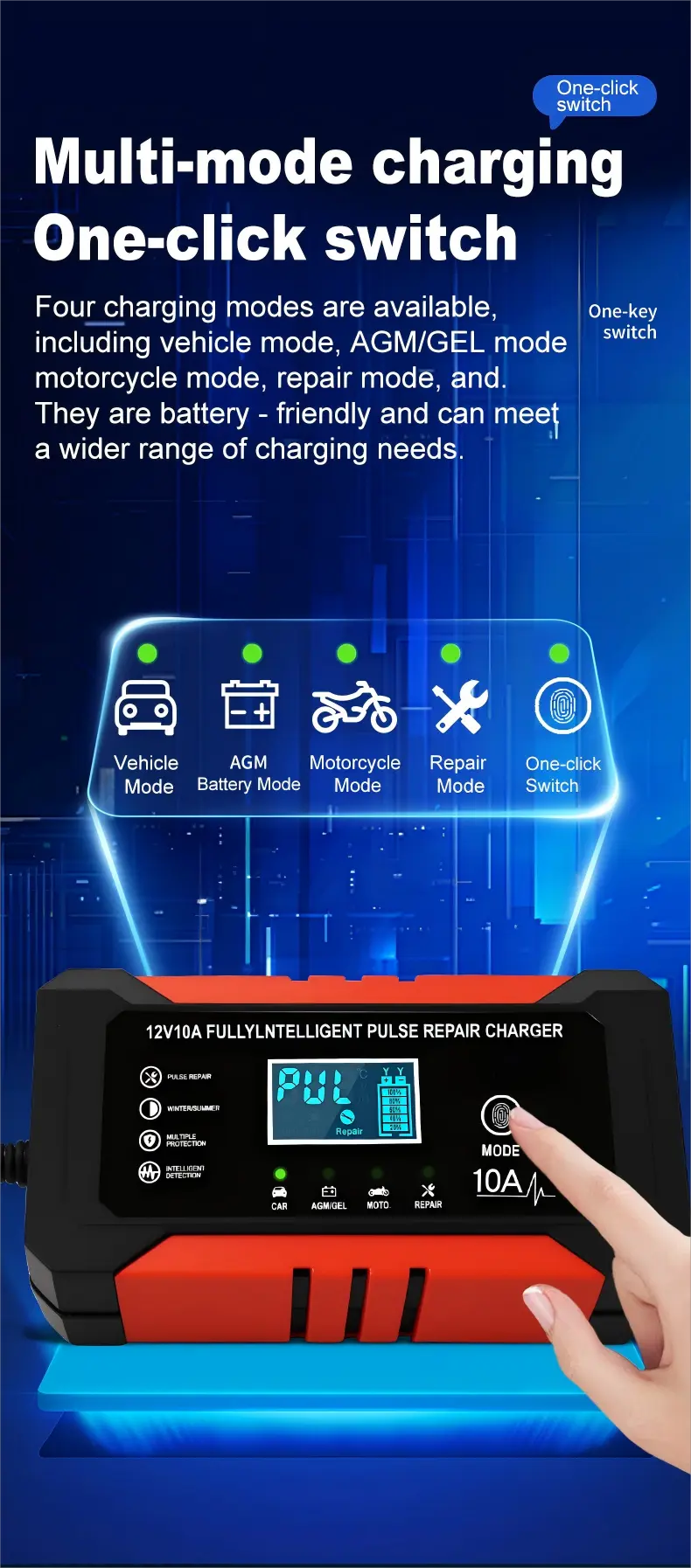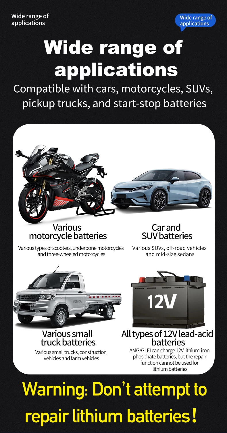 1. التوافق الشامل ودعم البطاريات المتعددة: يعمل بسلاسة مع جميع أنواع البطاريات 12 فولت، بما في ذلك حمض الرصاص، وAGM، والجيل، وLiFePO4، ويغطي سعة البطارية من 6 أمبير إلى 180 أمبير. يزيل نطاق الإدخال الواسع 110 ~ 230 فولت القيود الإقليمية، مما يجعله قابلاً للاستخدام في أكثر من 100 دولة ومنطقة حول العالم.