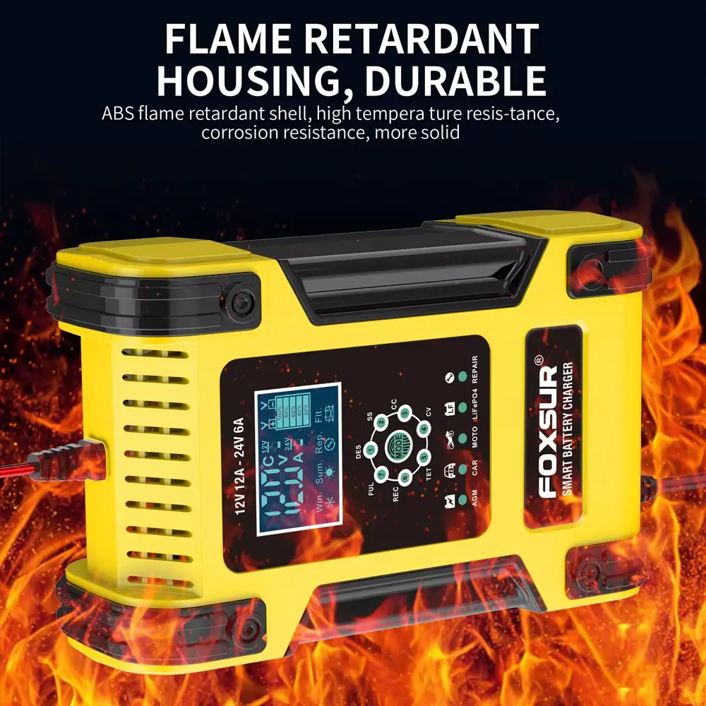 على عكس أجهزة الشحن الأخرى الموجودة في السوق، يوفر شاحن بطاريات الرصاص الحمضية الذكي ذو 7 أقسام بقدرة 12 فولت و24 فولت و12 أمبير ميزات أمان شاملة لحماية البطارية والشاحن نفسه.
