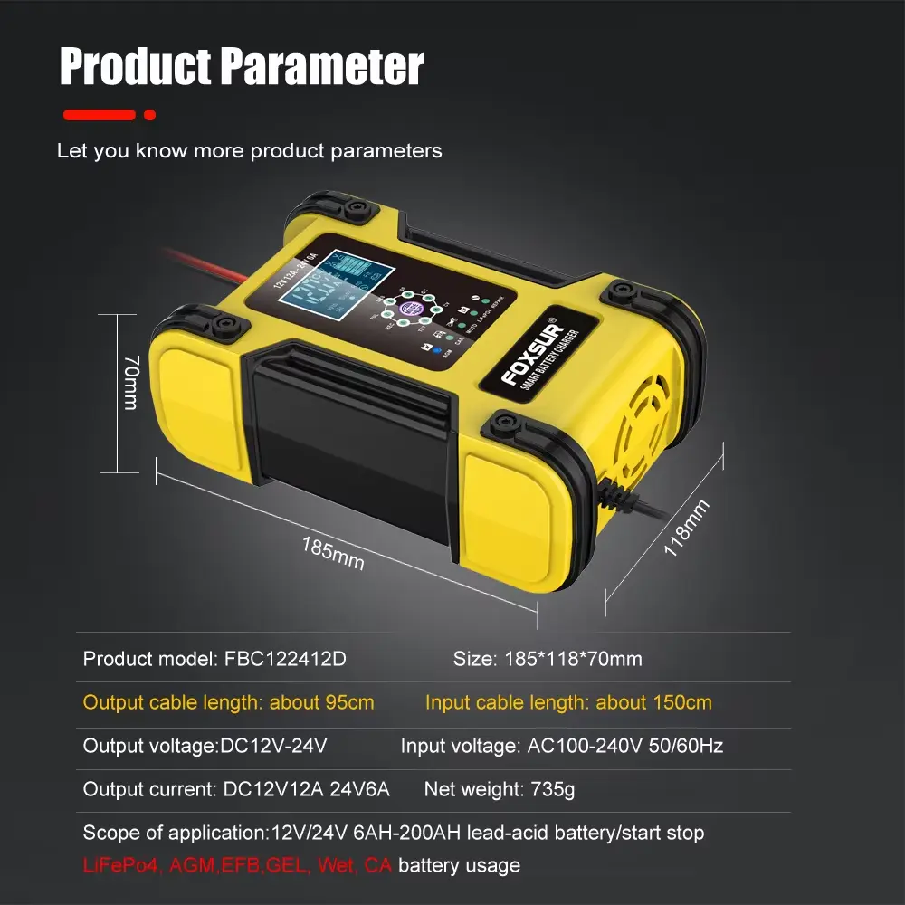 • أنواع البطاريات: معظم أنواع بطاريات الرصاص الحمضية بما في ذلك بطاريات الكالسيوم والجل AGM وLiFePo4 والرطبة وحمض الرصاص وما إلى ذلك.