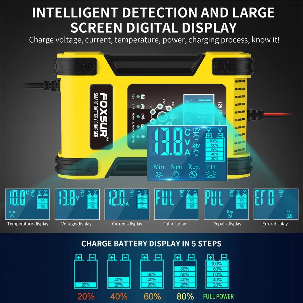 الكشف التلقائي عن الجهد الكهربائي: يكتشف شاحن البطارية الذكي الكامل هذا تلقائيًا ما إذا كان النظام 12 فولت أو 24 فولت ويضبط ملف الشحن الخاص به وفقًا لذلك. تلغي هذه الميزة الحاجة إلى التعديلات اليدوية، مما يوفر تجربة خالية من المتاعب حقًا.