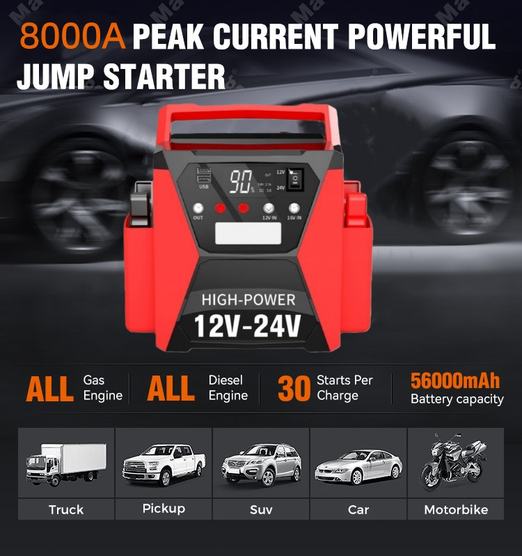 تقدم STARWELL شاحن البطاريات الذكي Car Jump Starter 12V/24V عالي الأداء، والذي سيغير قواعد اللعبة لأصحاب المركبات الذين يبحثون عن الموثوقية والذكاء في صيانة البطارية وبدء التشغيل في حالات الطوارئ. مزود بتيار ذروة 8000 أمبير وتيار بدء 4000 أمبير، يجمع شاحن البطارية الذكي ثنائي الجهد هذا بين الطاقة القوية والتكنولوجيا الذكية، مما يجعله مناسبًا لجميع محركات الغاز ومحركات الديزل حتى 15 لترًا، ويغطي السيارات والشاحنات والمركبات الترفيهية والدراجات النارية والقوارب وحتى المركبات التجارية الثقيلة.