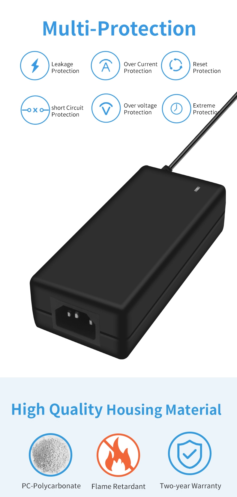 محول الطاقة STARWELL معتمد وفقًا للمعايير الدولية مثل UL/CE/FCC/CCC ويدمج حماية مكونة من 6 طبقات (يتم تشغيل OVP عند 15 فولت، وOCP عند 8.5 أمبير، وOTP عند 85 درجة مئوية، ودائرة قصر، وزيادة التيار، وحماية ESD). يصل غلاف مثبطات اللهب PC+ABS إلى تصنيف القابلية للاشتعال V0، ويقاوم الاحتراق لمدة 30 ثانية عند الاحتراق عند درجة حرارة 750 درجة مئوية، مما يزيل مخاطر السلامة المحتملة.