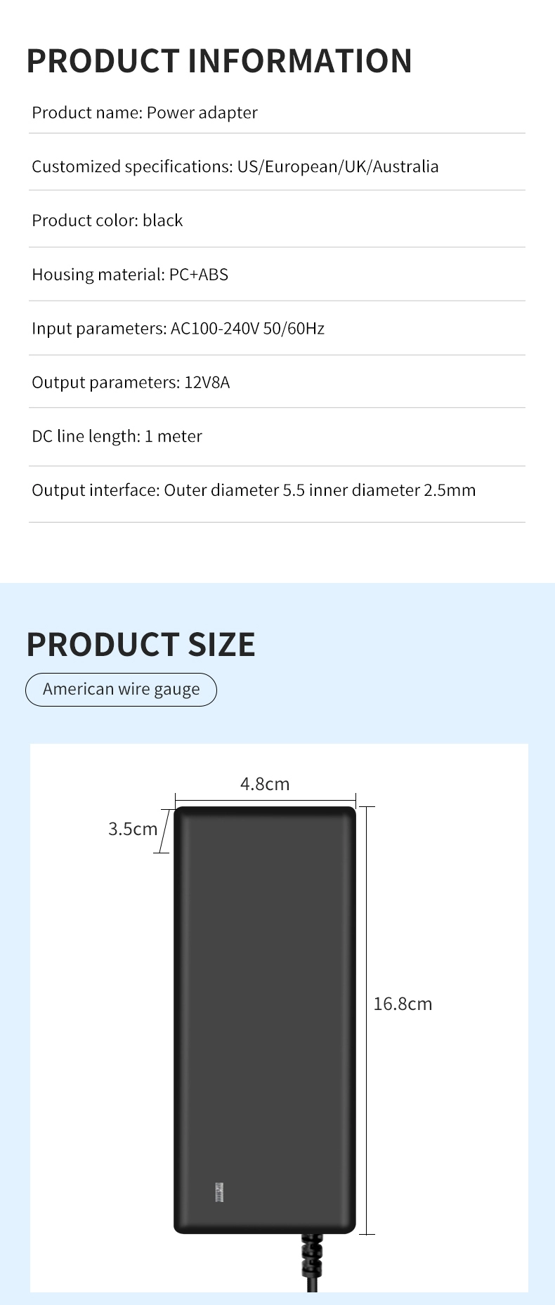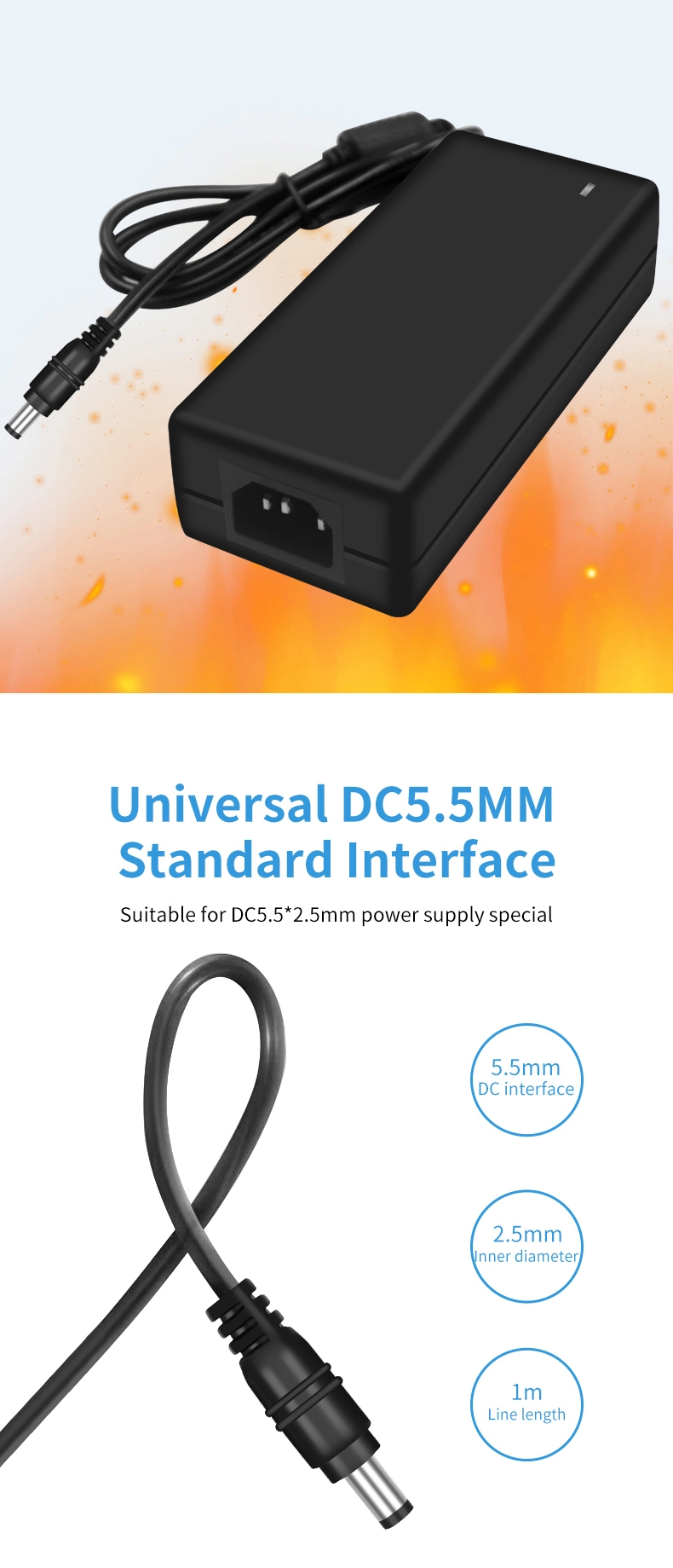 مدخلات الجهد العريض AC 100-240V متوافقة مع شبكات الطاقة في أكثر من 100 دولة حول العالم. يتكيف كابل الإخراج الممتد بطول 1.5 متر (قطر 1.0 مم²) مع موصل DC قابل للدوران 180 درجة مع سيناريوهات التثبيت المختلفة. بفضل الحجم الصغير الذي يبلغ 120 × 60 × 30 مم فقط، فهو أصغر بنسبة 35% من المحولات التقليدية بنفس الطاقة، ويزن 280 جرامًا فقط - مما يؤدي إلى تحسين إمكانية النقل بنسبة 50%.