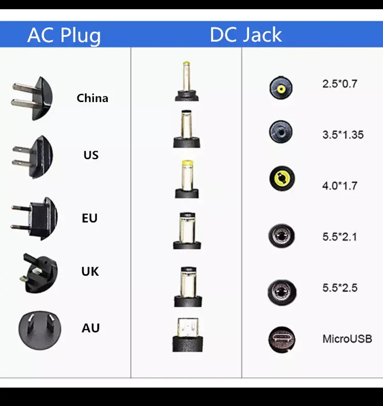 نوع الموصل: موصل أسطواني قياسي للتيار المستمر (تشمل الأحجام الشائعة 5.5 مم × 2.1 مم أو 5.5 مم × 2.5 مم، قابلة للتخصيص بناءً على متطلبات الجهاز).