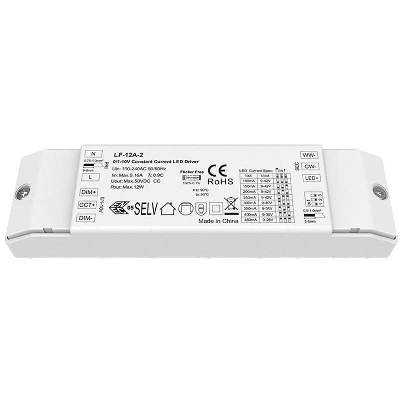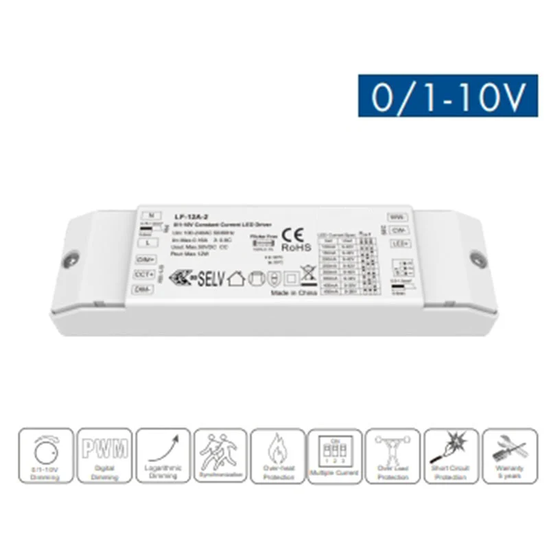 1. تعتيم CCT دقيق 0-10 فولت: يدعم محرك LED القابل للتعتيم بتيار ثابت 12 وات 0-10 فولت CCT السطوع السلس وتعديل درجة حرارة اللون مع استجابة التعتيم الخطي، وهو متوافق مع وحدات التحكم السائدة 0-10 فولت للتحكم في الأجواء المخصصة.