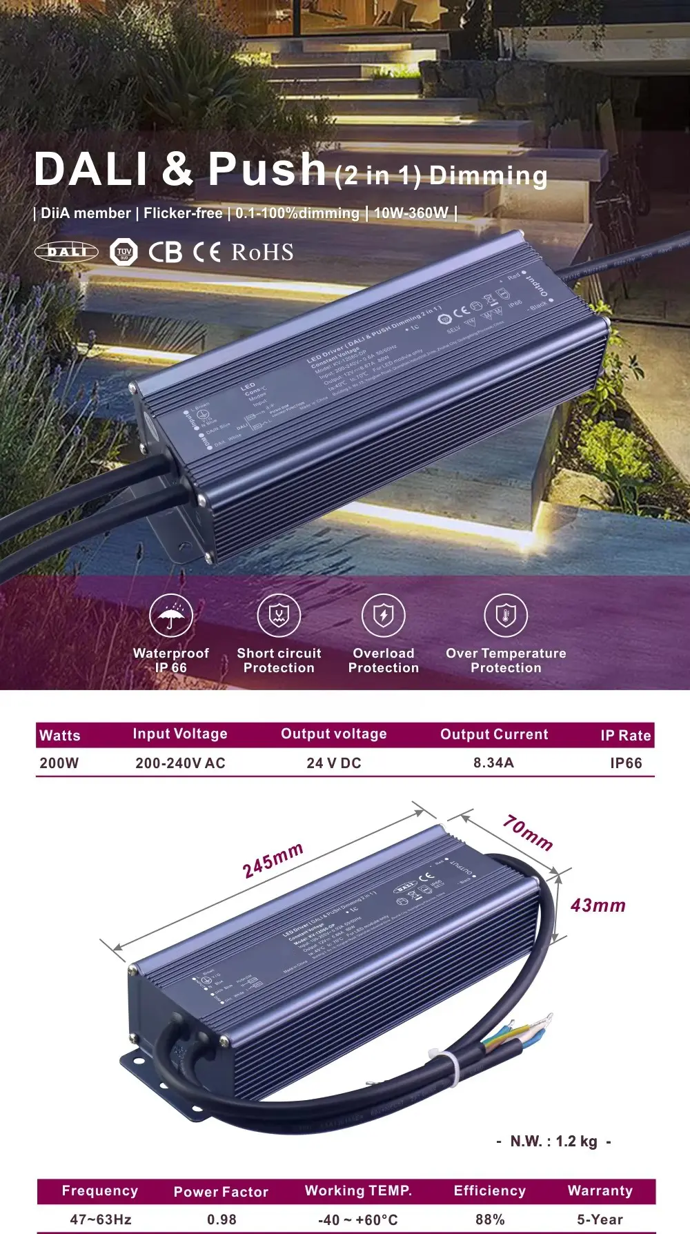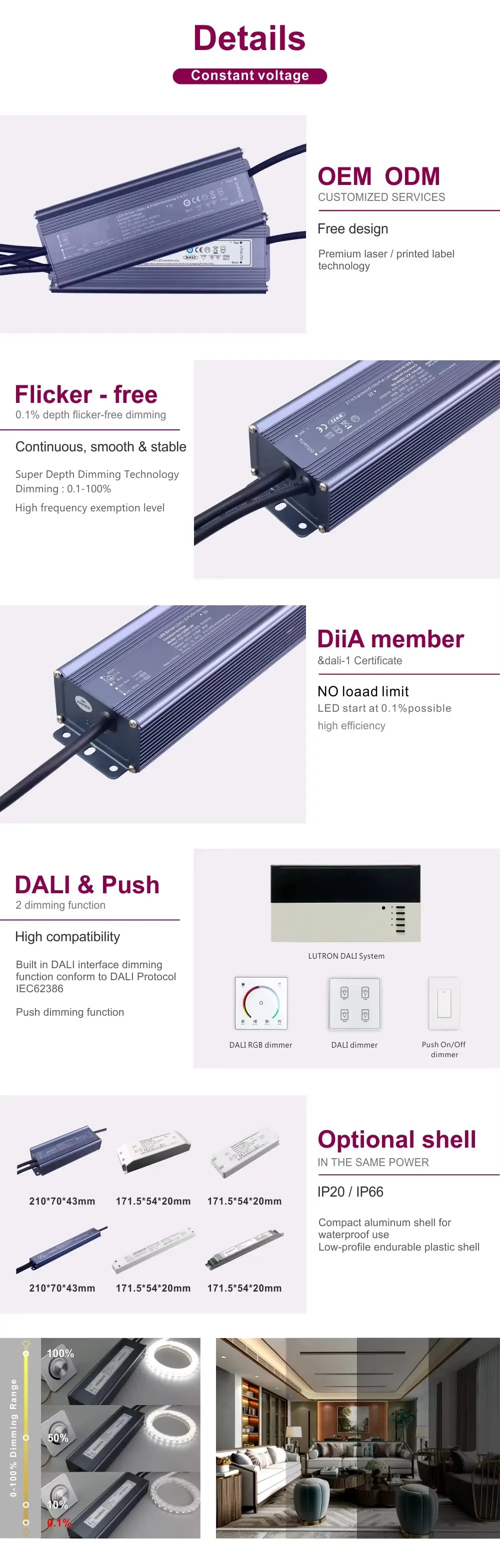 تم تصميمه للحصول على أداء لا تشوبه شائبة، فهو يتميز بعملية خالية من الوميض ونطاق تعتيم فائق السلاسة بنسبة 0.1% إلى 100%، مما يتيح جودة إضاءة مثالية وخلق أجواء محيطة. متوفر في نطاق طاقة واسع من 10 وات إلى 360 وات، مع مخرج 12 فولت أو 24 فولت تيار مستمر، وهو حل الطاقة المثالي والمقاوم للمستقبل لمجموعة واسعة من شرائط ووحدات LED ذات الجهد الثابت.