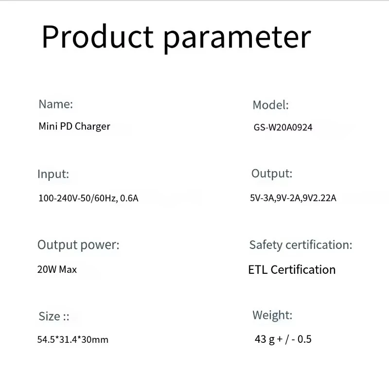 مواصفات شاحن PD قابس الإصدار الياباني 20 وات: