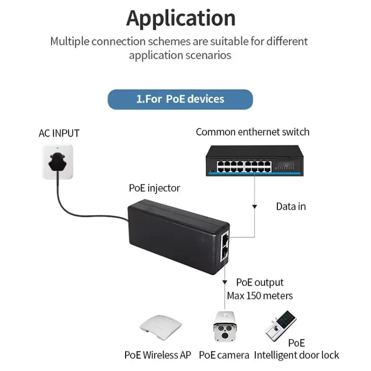 يستخدم حاقن PoE السلبي نقل الطاقة المباشر دون مصافحة البروتوكول، مما يقلل من تعقيد النظام ويحسن التوافق مع معدات الشبكات المحددة.