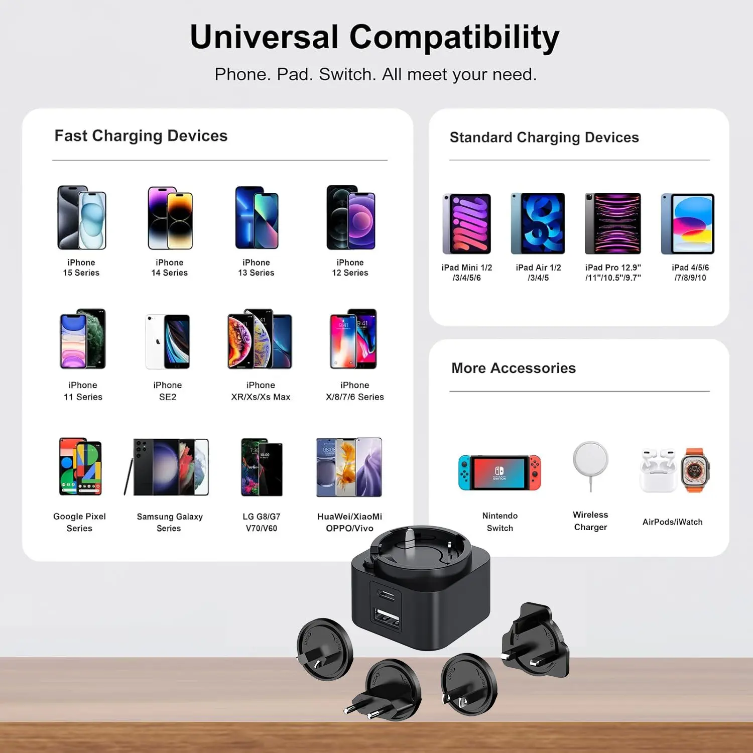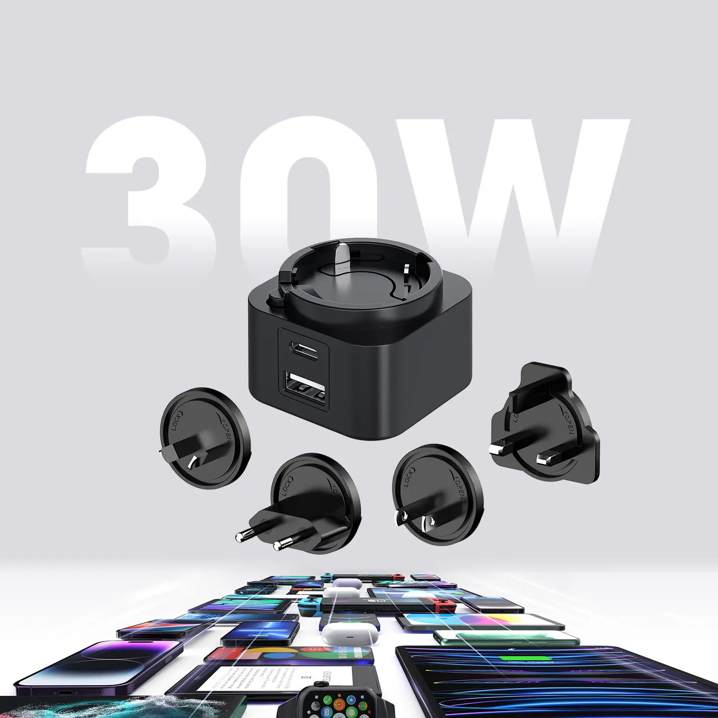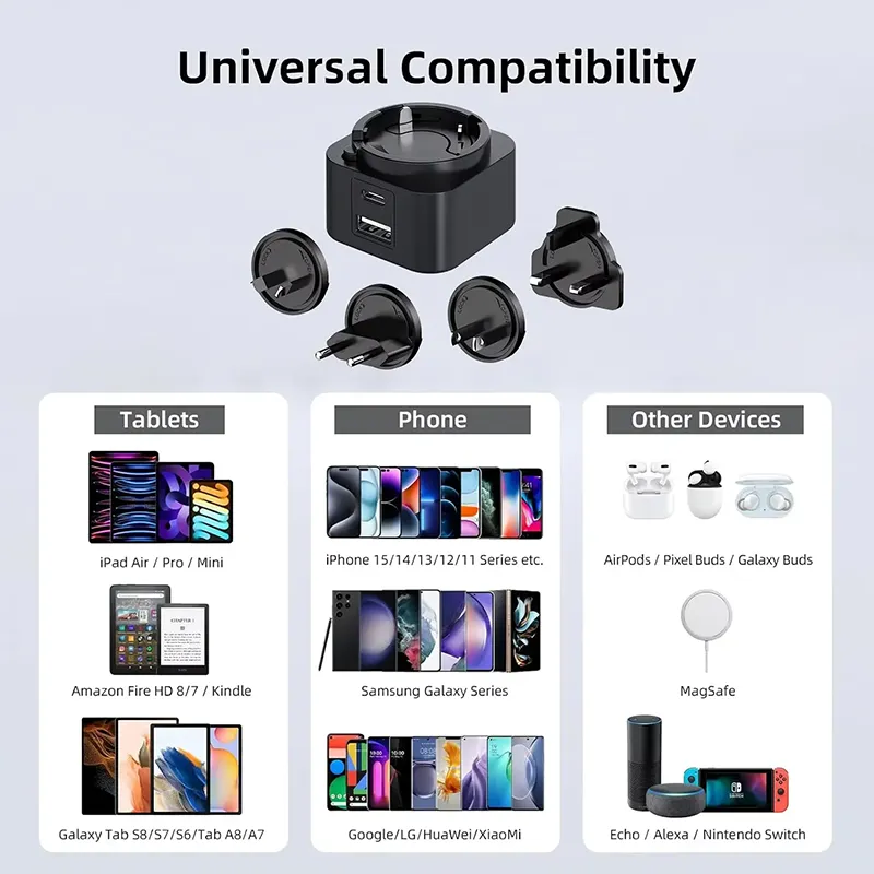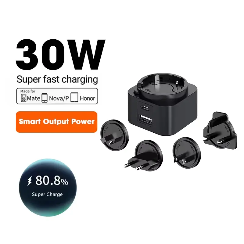 تعددية الاستخدامات هي المفتاح. يتيح لك تصميم المنفذ المزدوج (USB-C/USB-A) شحن جهازين في وقت واحد. يتميز شاحن PD ذو القابس القابل للتبديل بقدرة 30 واط بمجموعة من المقابس القابلة للتبديل (الولايات المتحدة/الاتحاد الأوروبي/المملكة المتحدة/الاتحاد الأفريقي)، مما يجعله رفيقك المثالي في السفر في جميع أنحاء العالم. سواء كنت تقوم بشحن هاتف ذكي أو جهاز لوحي أو كمبيوتر محمول، فإن التوافق العالمي يضمن أداءً عالي المستوى.