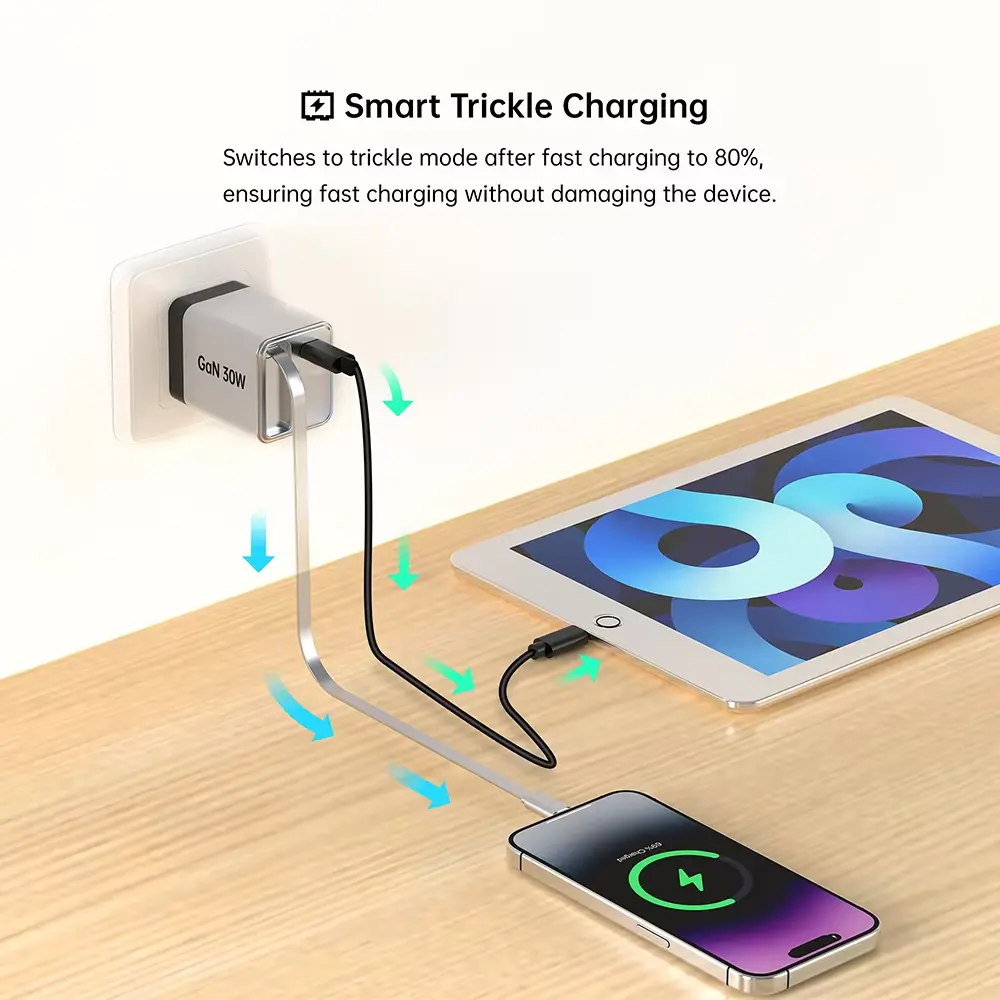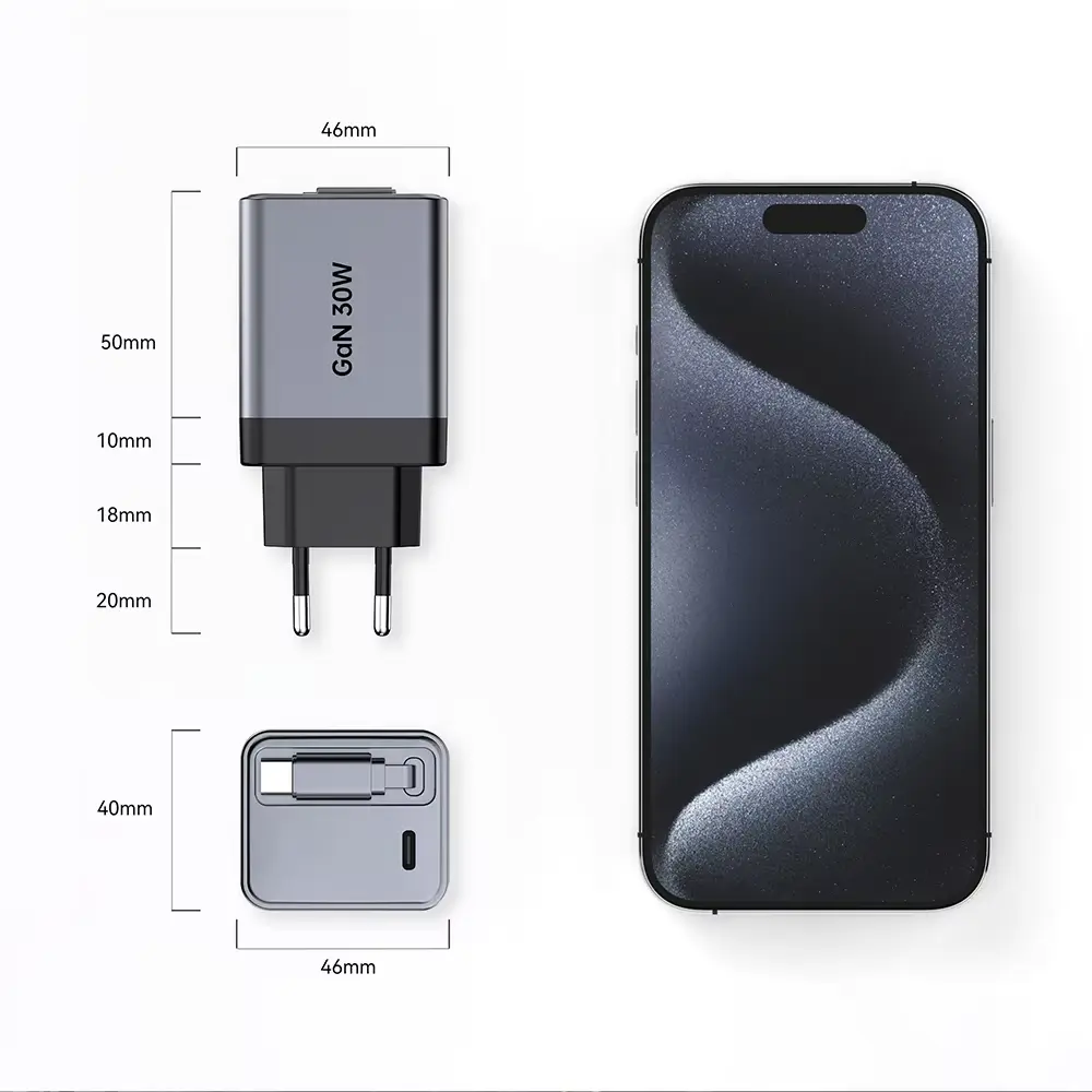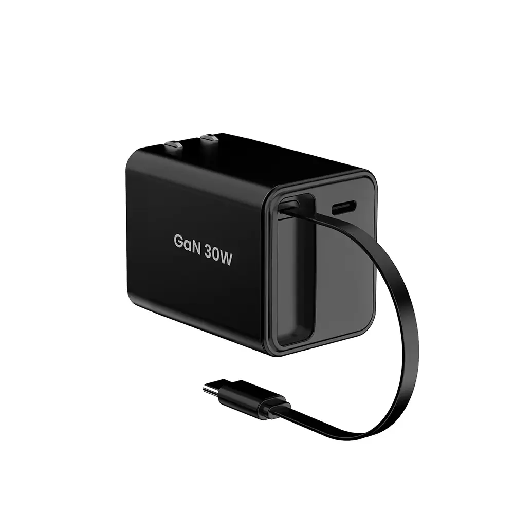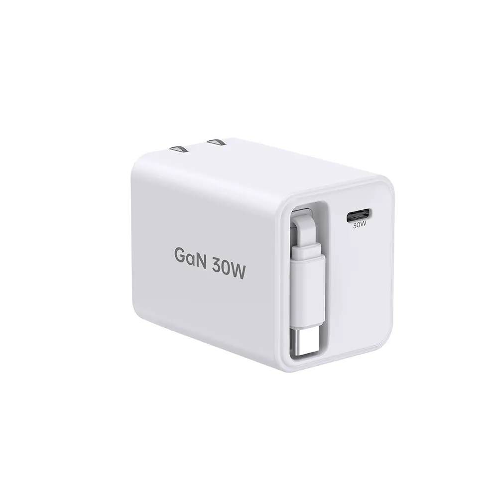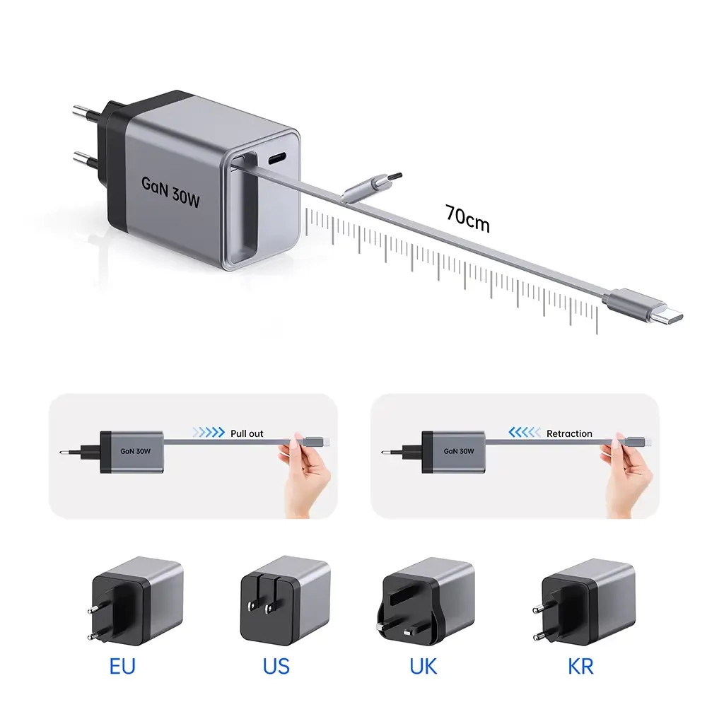 شاحن سريع بقدرة 30 واط مع كابل من النوع C قابل للسحب، تصميم خفيف الوزن للغاية بحجم الجيب يجعل من السهل حمله. إنه الخيار الأمثل للمنزل أو المكتب أو السفر.