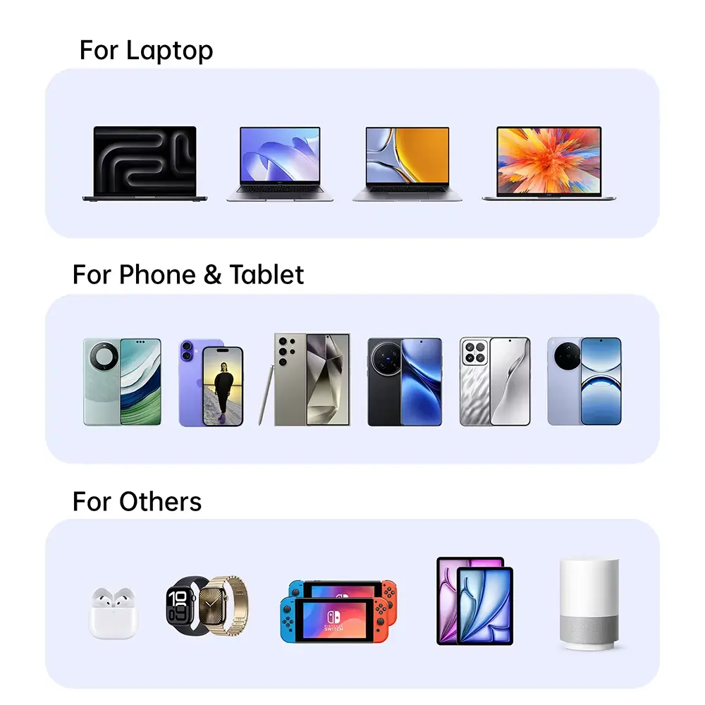 متوافق مع أجهزة USB-C، بما في ذلك الهواتف المحمولة وسماعات الرأس وملحقات الألعاب. يكتشف تلقائيًا احتياجات الجهاز للشحن الآمن والفعال. 4. إمكانية النقل الجاهزة للسفر