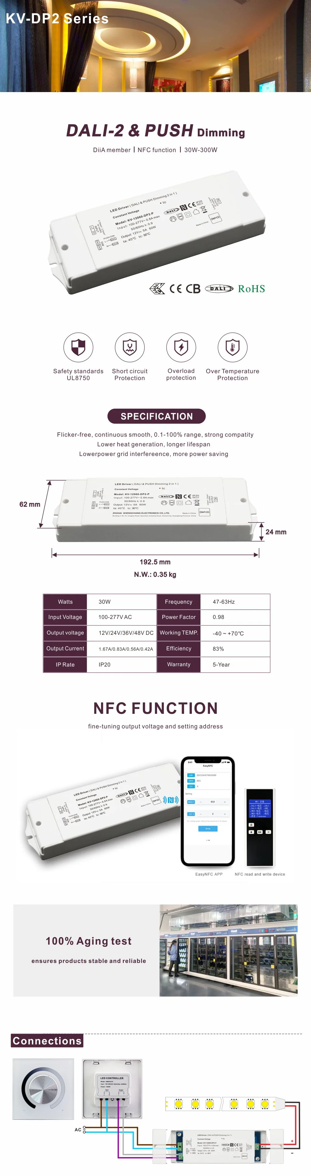 بالإضافة إلى وظيفة DALI القوية، يوفر برنامج التشغيل هذا تجربة تعتيم رائعة. إنه يحقق تأثير NFC Dimming Smooth No Flicker الناعم الحريري، مما يزيل تمامًا الوميض والاهتزاز المرئي حتى عند مستويات السطوع المنخفضة، ويحمي البصر بشكل فعال ويخلق بيئة إضاءة مريحة وصحية. إن نطاق جهد إدخال التيار المتردد الواسع (مدخل 100-265 فولت) يمكّنه من التكيف مع تقلبات الجهد في شبكات الطاقة في جميع أنحاء العالم، مما يضمن التشغيل المستقر في مناطق مختلفة.