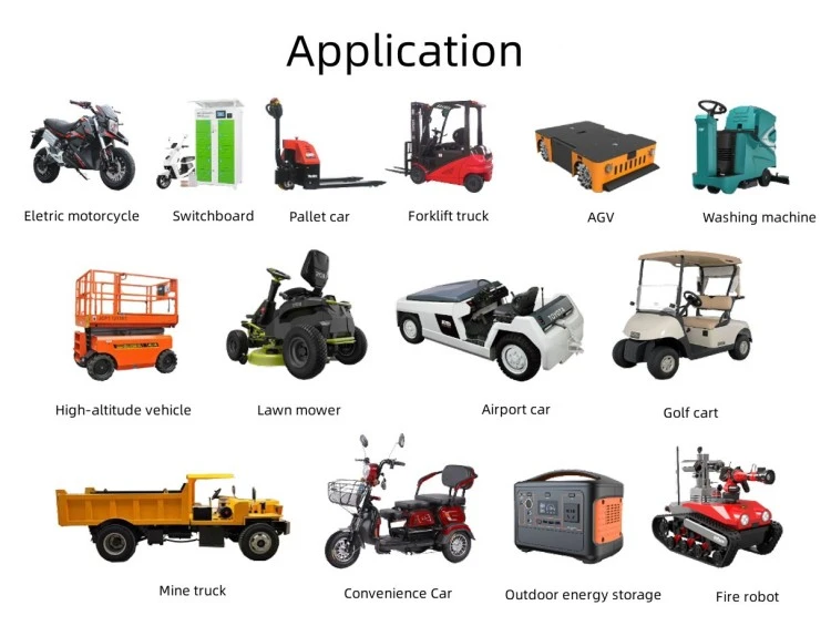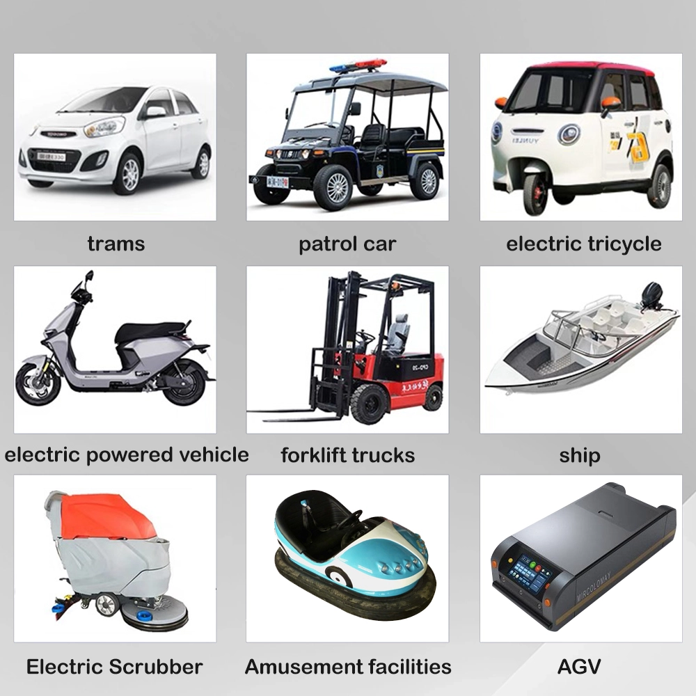 تطبيقات المنتج سيارات كهربائية وألعاب ترفيهية المركبات السياحية وعربات الغولف مركبات الدورية وعربات الأمن الرافعات الشوكية ومعدات مناولة المواد ماكينات غسيل الارضيات وتنظيفها المركبات الموجهة الآلية (AGVs) للمستودعات السفن الكهربائية والقوارب وسفن المرافق البحرية