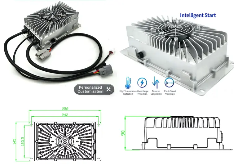 · نماذج متعددة الفولتية: متوفرة بجهد 24 فولت (15 أمبير)، و36 فولت (10 أمبير)، و48 فولت (8 أمبير)، و60 فولت (6 أمبير)، و72 فولت (5 أمبير) لتناسب أنظمة المركبات الكهربائية المتنوعة.