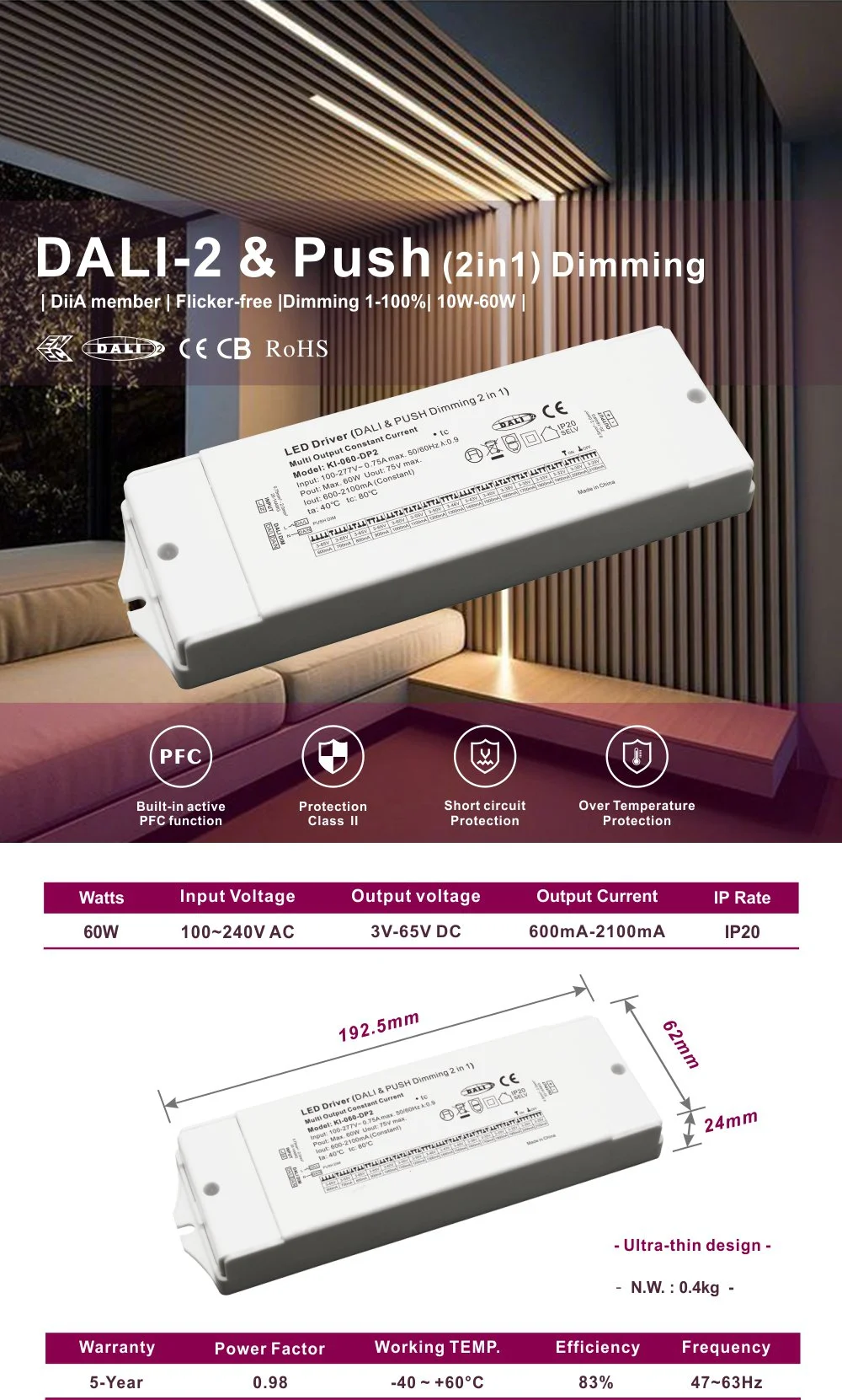 باعتباره مشغل تيار مستمر DALI Dimming CCT LED بقدرة 60 وات، فهو يعتمد تقنية التحكم في التيار المستمر ذات الحلقة المغلقة المتقدمة لضمان أن تيار الخرج (القيمة النموذجية هي 700 مللي أمبير، والتي يمكن تخصيصها وفقًا لمتطلبات وحدة LED للعملاء) مستقرة للغاية. هذا التصميم يتجنب بشكل فعال توهين الضوء أو انحراف اللون الناتج عن تقلبات التيار في LEDs، مما يضمن بشكل أساسي السطوع على المدى الطويل وعمر الخدمة للمصابيح. إن نطاق إدخال الجهد الكهربي الواسع وخصائص خرج التيار الثابت تجعله متوافقًا تمامًا مع المواصفات المختلفة لمصابيح السقف LED والمصابيح الكشافة ومصابيح اللوحة والأضواء الخطية ووحدات شريط الإضاءة.