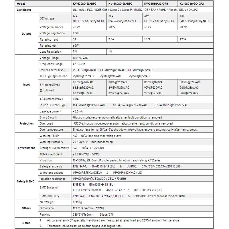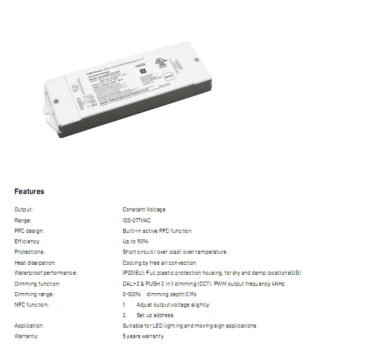 اعتماد التعتيم الرقمي DALI، فهو يدعم التعتيم السلس الخالي من الوميض بنسبة 0.1%-100% وضبط CCT الدقيق من 2700 كلفن إلى 6500 كلفن، مما يحافظ على ثبات السطوع أثناء تغيرات درجة حرارة اللون. يعزز PFC النشط المدمج الكفاءة بنسبة تصل إلى 88%، مع استهلاك منخفض للطاقة بدون تحميل. إنه يتميز ببدء التشغيل الناعم، والجهد الزائد، والتيار الزائد، وحماية الدائرة القصيرة، مما يضمن التشغيل الآمن.