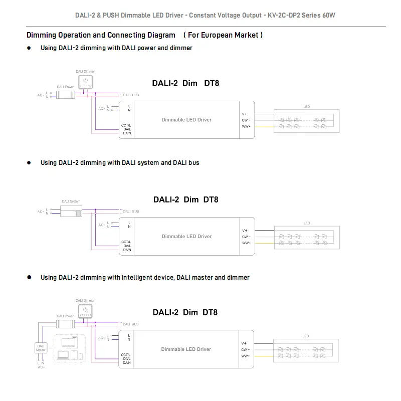 يعد برنامج تشغيل DALI CCT Dimming LED عالي الجودة بقدرة 60 وات من مصنع Starwell حلاً احترافيًا للطاقة لإضاءة LED بيضاء قابلة للضبط، ومتوافقًا مع بروتوكول IEC 62386 DALI-2 DT8. إنه يقبل إدخالاً واسعًا من 100 إلى 240 فولت تيار متردد، مع خرج جهد ثابت قياسي 12 فولت/24 فولت تيار مستمر، مما يوفر طاقة ثابتة تصل إلى 60 وات لشرائط وألواح LED.