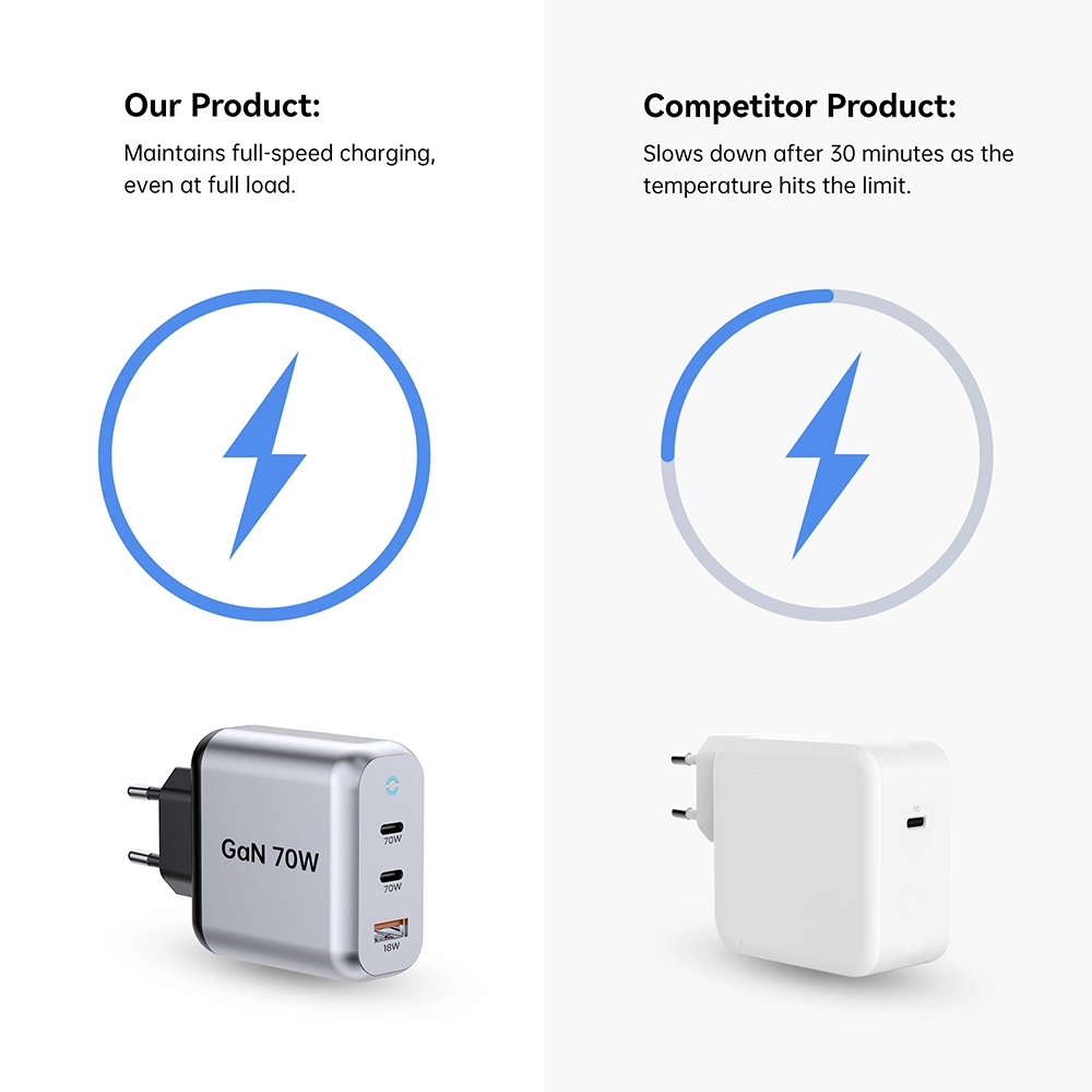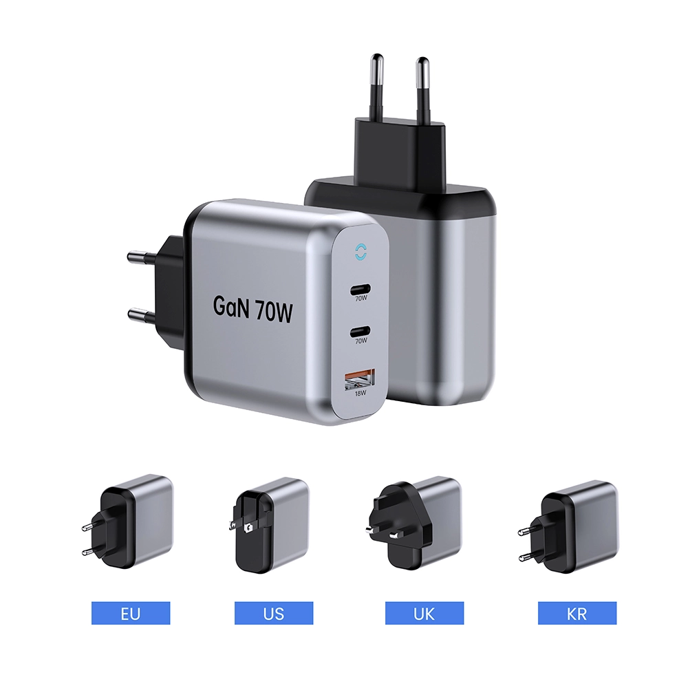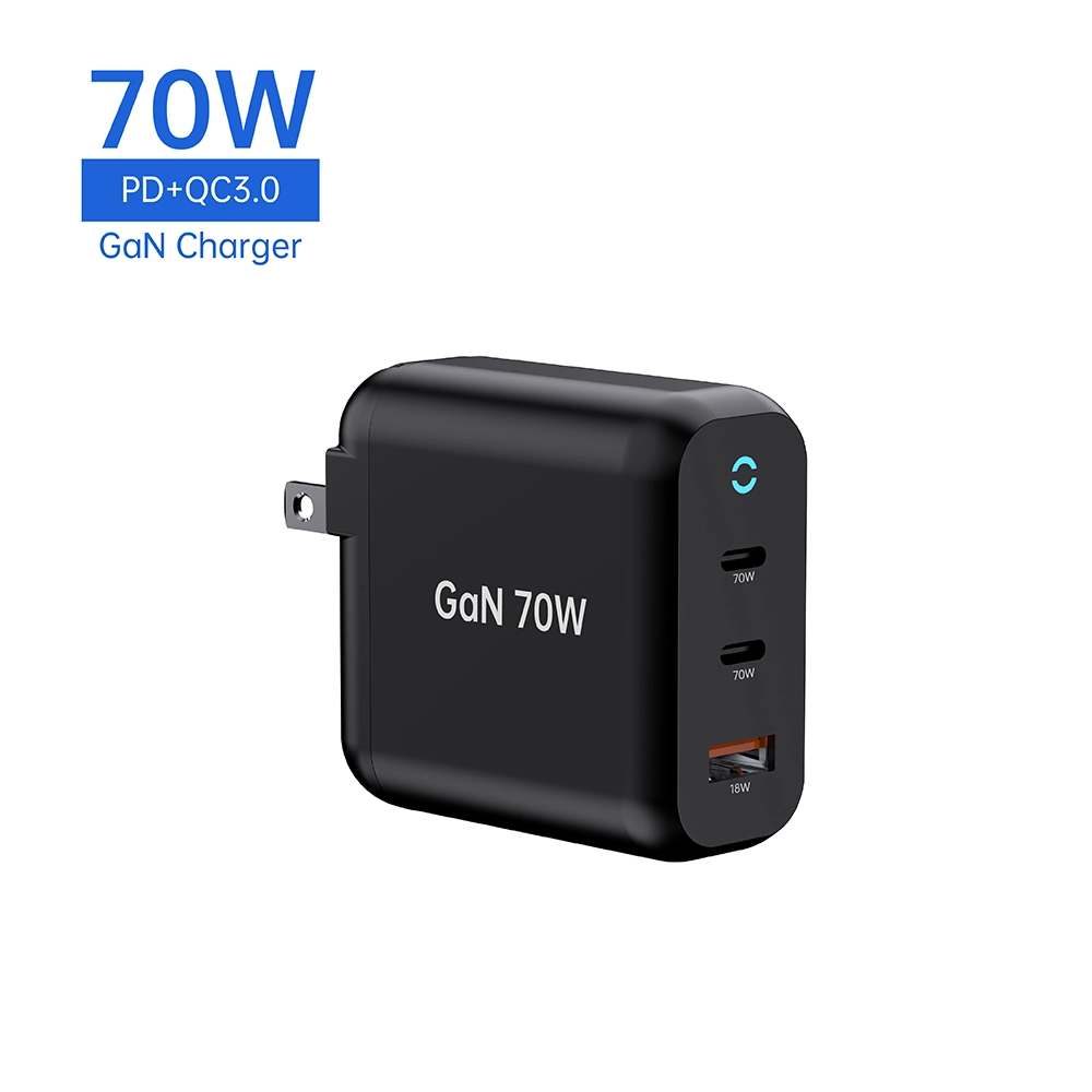 شاحن سريع متين بقدرة 70 وات PD من Starwell للكمبيوتر اللوحي latpop يُسمى أيضًا الشاحن السريع 70 وات GaN: 2C1A، يلبي الحاجة اليومية للشحن السريع للهواتف المحمولة والأجهزة اللوحية. صغير الحجم، قوي الأداء، مع تقنية نيتريد الغاليوم المتقدمة. عند استخدامها في منفذ واحد، فإن الحد الأقصى لطاقة الإخراج لواجهة USB-C1 هو 70 وات. عند استخدام المنفذين معًا، يظل USB-C1 يحتفظ بالشحن السريع بقدرة 45 وات PD. ويدعم بروتوكولات الشحن السريع المتعددة، بما في ذلك PD3.0 وPPS وQC4+ وQC3.0، مما يضمن توافقًا واسعًا مع الأجهزة المختلفة