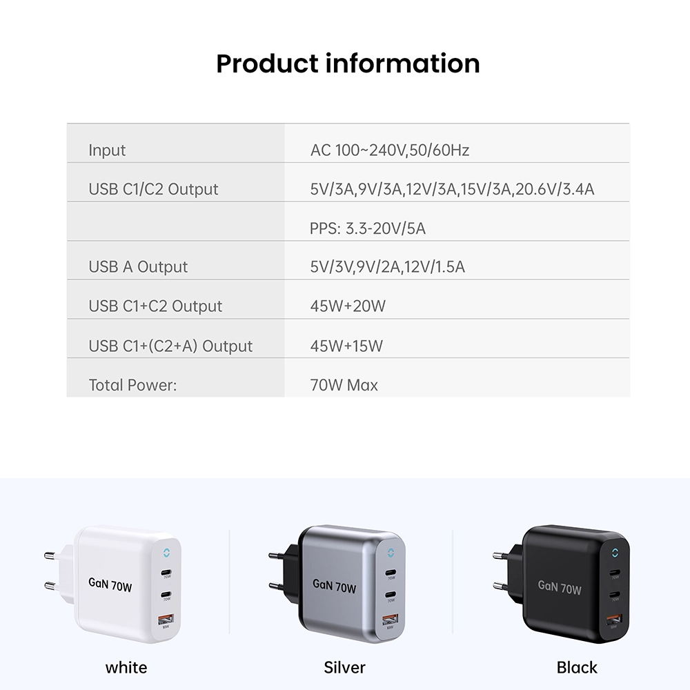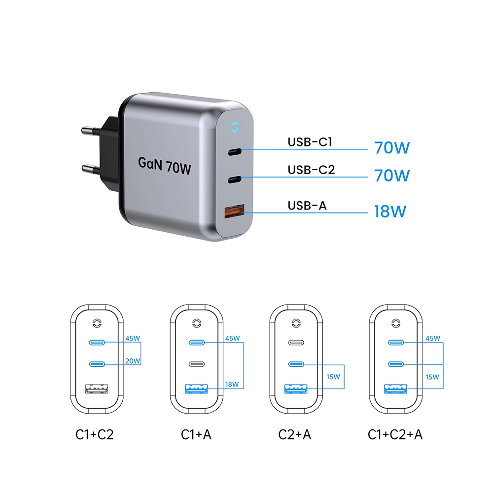 خرج C1/C2: 5V3A، 9V3A، 12V3A، 15V3A، 20.6V3.4A (70 وات كحد أقصى) PPS: 3.3-11V 4.05A مخرج USB-A: 5V3A، 9V2A، 12V1.5A 3.3-11V 2A (22W كحد أقصى) C1 + C2 الإخراج: 45 واط + 20 واط C1 + C2 + USB-A الإخراج: 45 واط + 5 فولت 3 أمبير الإجمالي: 70 واط |