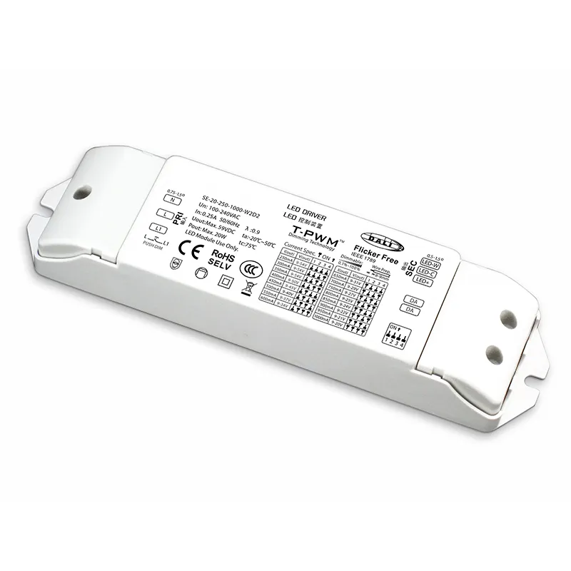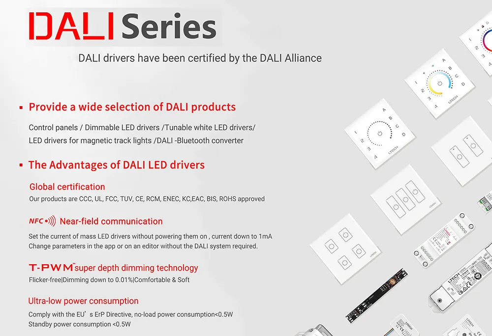 التحكم المتقدم في التعتيم DALI - يتيح التعتيم الرقمي من 0.1% إلى 100% بدقة عالية، ويدعم ما يصل إلى 64 عنوان DALI للتحكم الفردي أو الجماعي في أنظمة الإضاءة الآلية.
