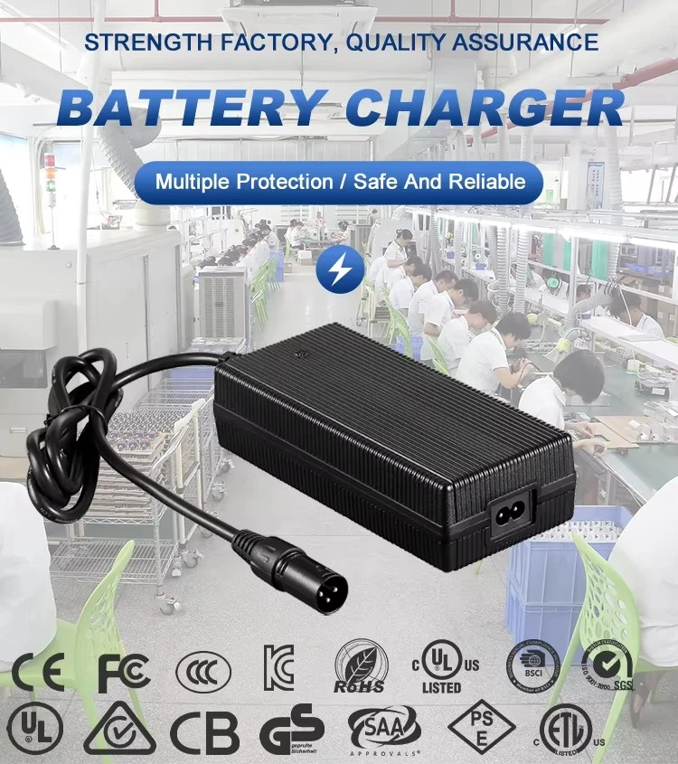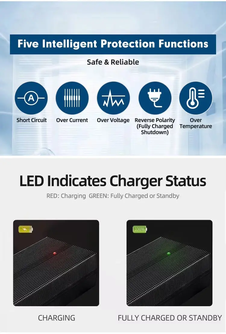 التوافق العالمي والسلامة القوية: يتميز بمدخل عالمي 100-240 فولت تيار متردد، ويعمل بسلاسة في جميع أنحاء العالم. يعمل الشحن الذكي المتقدم ثلاثي المراحل (CC/CV) على تحسين صحة البطارية بينما تضمن وسائل الحماية الشاملة - بما في ذلك الدائرة القصيرة والجهد الزائد ودرجة الحرارة الزائدة والحمل الزائد - التشغيل الآمن والخالي من القلق. تم بناء الهيكل المتين بمواد مقاومة للحريق لتعزيز الموثوقية في البيئات الصعبة.