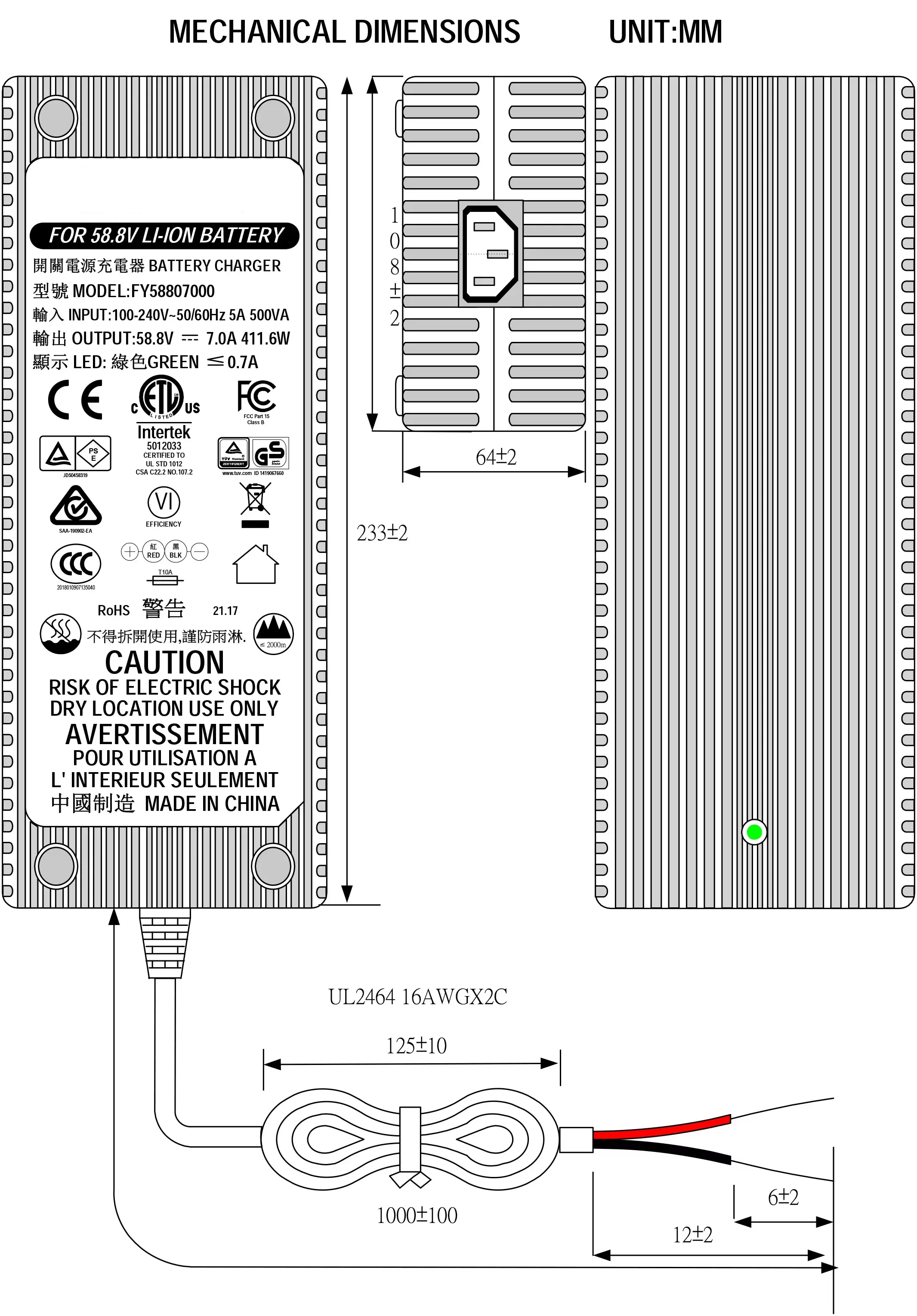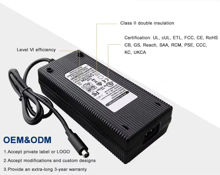 معتمد وفقًا لمعايير UL وETL وCUL وGS وCE وBS وSAA وKC وPSE وCB وFCC وEMC وRoHS وREACH، ويوفر هذا الشاحن طاقة فعالة وسريعة وآمنة لتطبيقات التنقل الكهربائية المطلوبة.