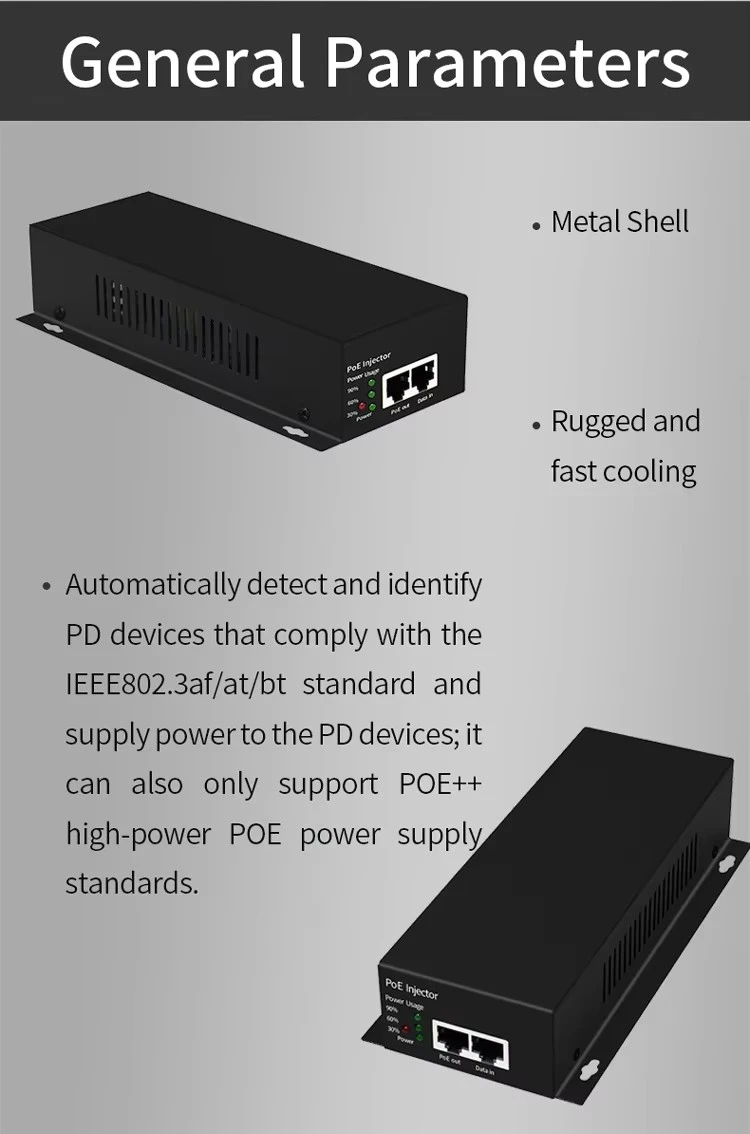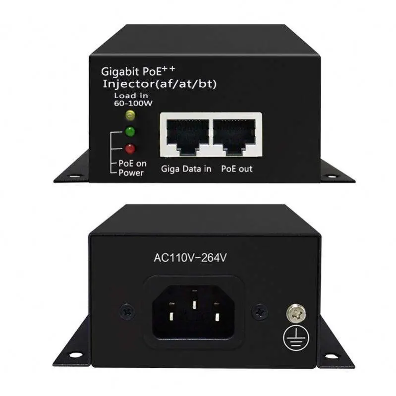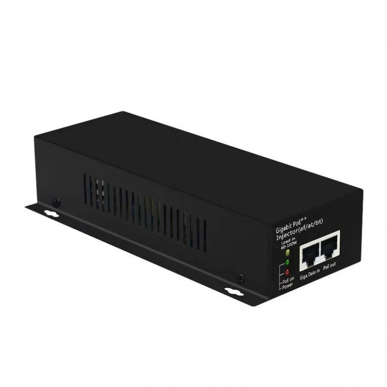 يتم تقديم حاقن POE النشط عالي الجودة 60W من قبل الشركة المصنعة الصينية Starwell. يتميز بمنفذ إدخال بيانات بسرعة 10/100/1000 ميجا بت في الثانية ومنفذ إخراج PoE (البيانات + الطاقة). إنه يدعم بشكل كامل متطلبات القطبية البديلة لـ 802.3bt، وذلك باستخدام جميع الأزواج الأربعة (1/2+، 3/6- و4/5+، 7/8-) لنقل البيانات في وقت واحد وإمدادات الطاقة 48 فولت تيار مستمر.