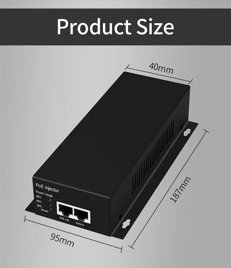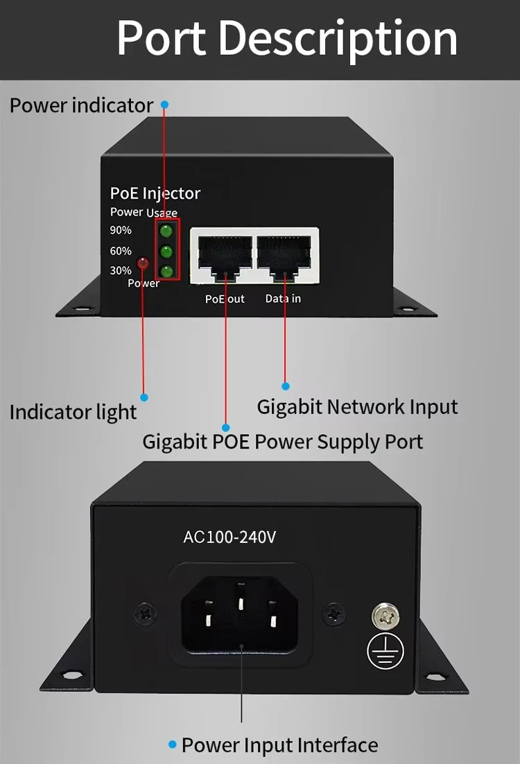 أداء طاقة موثوق مع نطاق جهد الإدخال AC100-240V وإخراج DC48V1.25A المستقر، يوفر حاقن POE الذي يعمل بالبطارية طاقة PoE نظيفة ومتسقة 48V للأجهزة المتصلة. وهو يدعم التكوين الأساسي لخط الطاقة 1/2,4/5(+) و3/6,7/8(-)، مما يضمن التوافق الواسع مع مختلف الأجهزة التي تعمل بالطاقة PoE في الطرف المتلقي.