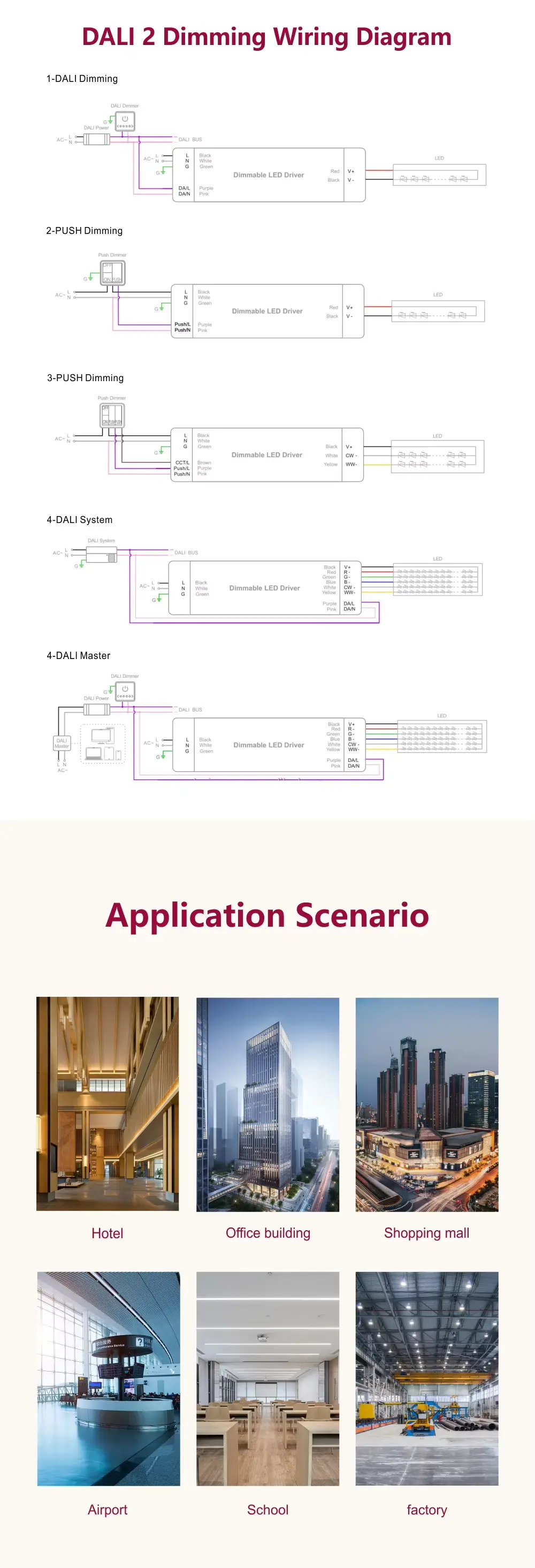 يعد برنامج تشغيل DALI Constant Current CCT Dimming Led مناسبًا للمشاريع المعمارية والتجارية والضيافة المتطورة، فهو يتيح التعديل الدقيق لدرجة حرارة لون الضوء وكثافته من محرك واحد. يضمن DALI-2 DT8 التحكم المستقبلي والقابل للتشغيل البيني للمشاهد المتطورة وإدارة الطاقة، بينما يعمل خيار Push Dimming اليدوي على تبسيط الإعدادات التي لا يتطلب فيها نظام تحكم مخصص.