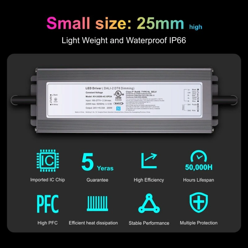 يهدف تصميمه الأساسي إلى تلبية متطلبات التثبيت والتطبيق الأكثر تطلبًا. يعتمد مصدر الطاقة وضع إخراج الجهد الثابت، مما يوفر جهدًا ثابتًا للتيار المستمر يبلغ 12 فولت أو 24 فولت، وهو مُحسّن لقيادة مصابيح ووحدات شريط LED المختلفة. ومن المثير للإعجاب أنه على الرغم من توفير قوة دفع قوية تبلغ 200 واط، فإنه يحقق حجمًا صغيرًا للغاية، مما يوفر مساحة التثبيت بشكل كبير في صناديق التوصيل أو الأسقف الضيقة. سلسلة المنتجات مرنة، وتقدم إصدارات قنوات مختلفة من 1 إلى 5 قنوات: الإصدار أحادي القناة مخصص للتعتيم النقي، والإصدار ثنائي القناة يتحكم بشكل مستقل في الضوء الأبيض البارد والدافئ لتحقيق ضبط CCT كامل النطاق، والإصدار ذو الخمس قنوات هو محرك DALI قوي بجهد ثابت RGB CCT قابل للتعتيم بقدرة 200 وات، قادر على التحكم في وقت واحد في لون RGB والضوء الأبيض البارد والدافئ، مما يولد مليارات الألوان والأجواء.