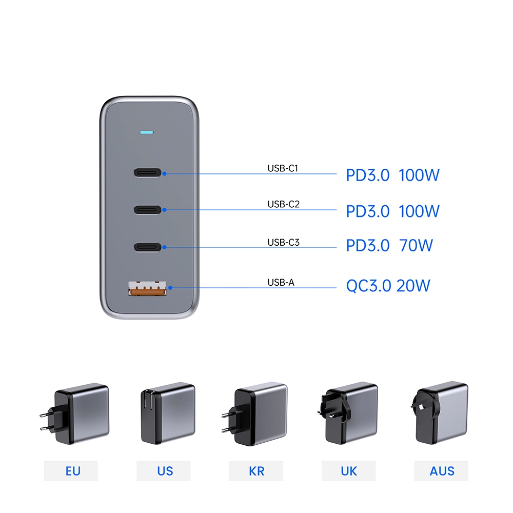 إخراج C1/C2: 5V3A، 9V3A، 12V3A، 15V3A، 20V5A، PPS:3.3-20V5A (100 واط كحد أقصى) إخراج C3: 5V3A، 9V3A، 12V3A، 15V3A، 20V3.5A، (70 واط كحد أقصى) PPS:3.3-11V5A مخرج USB-A: 5V3A، 9V2A، 12V1.67A، SCP:3.3-11V2A (22 واط كحد أقصى) C1 + C2/C1 + C3 الإخراج: 70 واط + 30 واط C1+C2+(C3+USB-A) الإخراج: 40 واط + 40 واط + 15 واط الإجمالي: 100 واط |
