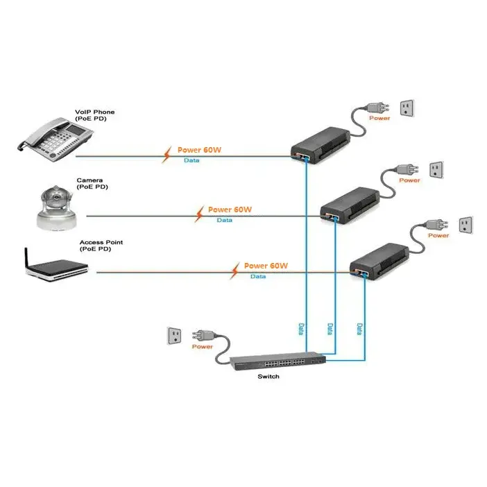 يوفر ما يصل إلى 60 واط من الإخراج ويدعم معايير IEEE 802.3bt/at/af بشكل كامل. يعمل على تشغيل الأجهزة منخفضة الطاقة (15.4 وات) والمعدات عالية الطاقة (30 وات/60 وات)، ويغطي جميع الأجهزة التي تعمل بالطاقة إيثرنت تقريبًا ويضمن توافقًا قويًا مع PoE.