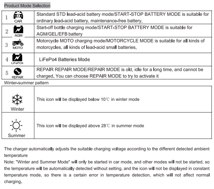 دعم واسع لنوع البطارية: متوافق مع كيميائيات البطارية المختلفة، بما في ذلك البطاريات القياسية المغمورة (الرطبة)، وAGM (حصيرة زجاجية ماصة)، والجل، وبطاريات الكالسيوم، مما يضمن الشحن الأمثل لكل نوع محدد.