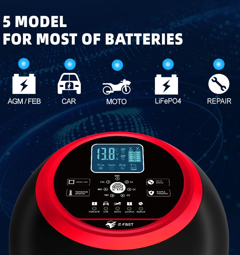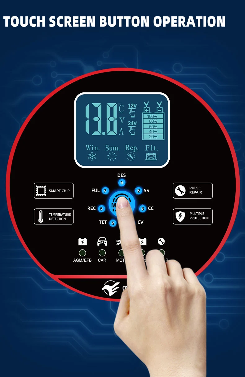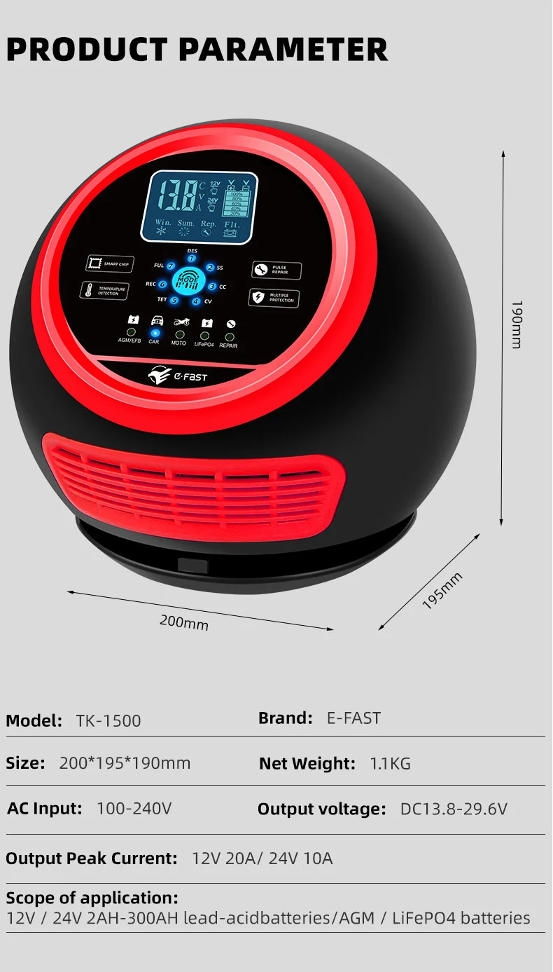 يتميز هذا الشاحن بتصميم مدمج ومبتكر ومجهز بشاشة LCD عالية الوضوح تعرض الجهد والتيار ودرجة الحرارة وتقدم الشحن وحالة البطارية في الوقت الفعلي، مما يجعل التشغيل واضحًا في لمحة. يحتوي على وظيفة إصلاح النبض المدمجة التي يمكنها تنشيط وإصلاح البطاريات القديمة، مما يطيل عمرها الافتراضي. باعتباره شاحنًا ذكيًا أوتوماتيكيًا بالكامل، يدعم TK-1500 عملية "التوصيل والنسيان": فهو يكتشف تلقائيًا جهد البطارية، ويختار وضع الشحن، ويتحول إلى وضع صيانة الشحن العائم بعد الشحن الكامل لمنع الشحن الزائد. إنه مثالي لصيانة بطارية المركبات المتوقفة لفترات طويلة أو المعدات الموسمية مثل جزازات العشب والقوارب.